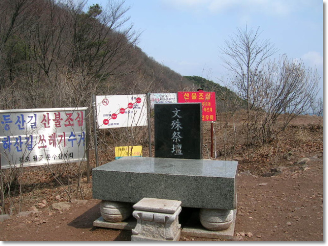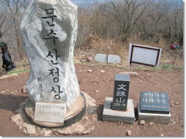 드디어 문수산 정상 오늘은 증명 사진을 생략했습니다 해발 376m라 하지만 바로 해수면에서부터 올랐기에 제법 높은 산입니다 "한남정맥"의 끝 봉우리 "문수산 정상"입니다. 요즘 우리가 학교에서 지리시간에 배운 산맥이라는 용어 대신 백두대간이니 정맥이니 하는 용어를 특히 산행을 좋아하는 사람들이 많이 사용하고 있습니다. 이 문제는 꼭 한번 짚고 넘어 가야 할 문제이라 '한남정맥"의 끝봉우리에서 같이 생각 해 보기로 하겠습니다. 이 이야기를 깊이 있게 얘기 하려면 이런 산행기 열개가 필요 할지도 모릅니다 그래서 간단 단순하게 저의 소견을 밝히려 하오니 그저 참고 하시기 바람니다. 다른 의견이 있으신 분들이나 저와 다른 생각을 하시는 분은 차분하게 의견개진 해 주시면 참고 하겠습니다. 대간,정간,정맥으로 우리나라 지형을 말하고싶어하시는 분들은 진정 그 의미를 알고 하시는지... 이런 용어는 옛날에 사용했던 것들인데 현대에 사용하는 것은 옛날로 돌아 가고 싶은 건지... 또 다분히 '우리 것이 좋은 것이여~'하며 애국주의, 민족주의적으로 사용 하고싶은건 아닌지... 옛것을 사용하면 좀 유식 해 보이는 듯해서인지... 멋모르고 쓰던 어떻던..... 모두 좋습니다. 대간,정간,정맥은 고려시대 도선선사에서부터 조선시대의 김정호의 대동여지도나 신경준의 산경표를 비롯한 지형학의 대다수를 차지하고 있는 우리나라 전통 지형 표시 용어입니다 이것의 핵심 내용은 산과 강이 있는 외관적 모습, 즉 地形的 모습 그대로를 표기 하는 것입니다 학교에서 배우는 地理는 사실 한일합방을 전후해서 일본놈들이 금을 비롯한 조선의 광산물을 수탈해 가기 위해 한반도의 지질 및 광물 조사를 빈번하게 실시하였는데 그때 광물 탐사의 학술 책임자가 우리에게도 잘 알려진 바로 일본의 지리학자 고또분지로(小藤文次郞)였으며 그는 땅위보다는 땅 속의 지질 구조에 더 관심이 많았기 때문에 지질학자 및 광산 기술자 등을 동원하여 땅 속 구조를 치밀하게 연구 해서 그 것을 바탕으로 지도를 만들었던 것입니다. 그래서 지질구조 즉 화강암이냐 광맥이 어디로 흐르느냐등을 표기하는 山脈으로 표기 한것이며 대부분 산줄기가 끊긴것과 상관없이 지하의 이어짐을 근간으로 거의 직선으로 표기 하고 있습니다. 많은 우리나라 사람들이 이것을 두고 일제의 산맥 표기를 맹비난하는 것입니다 우리나라 전통 지도는 地形的이었으며, 일제가 만든 것은 地質的이었습니다 어느 것이 더 바람직하냐? 비난만 할것이 아니라 냉정하게 생각 해야 한다고 생각 합니다. 옛날엔 地形따라 각 고을의 삶과 문화가 많이 달랐습니다. 그래서 地形的 표기가 중요했습니다. 그러나 현대로 갈수록 교통 도로의 발전으로 강은 교량으로 연결되고, 산은 터널로 뚤어져 地形的 각 고을의 삶과 문화가 사실상 서로의 편리한 교통 덕에 수많은 교류가 잘 이루어져 전국이 반나절 생활권으로 통해져 특별한 의미가 없어 졌습니다. 통신이나 인터넷의 발전까지 가세하면 더욱 그렇습니다 이제 地形을 나타내는 전통지도들은 등산객들에게나 필요한게 되 버렸습니다. 이제 이해가 좀 되시는지요.... 수탈의 목적으로 만들었다고 비난만 할것이 아니라 우리나라의 지질구조도 잘 알아야하겠습니다 저는 地形的 표기와 地質的 표기를 합쳐 여러 각도에서 활용 할수 있도록 해야 한다고 생각 합니다