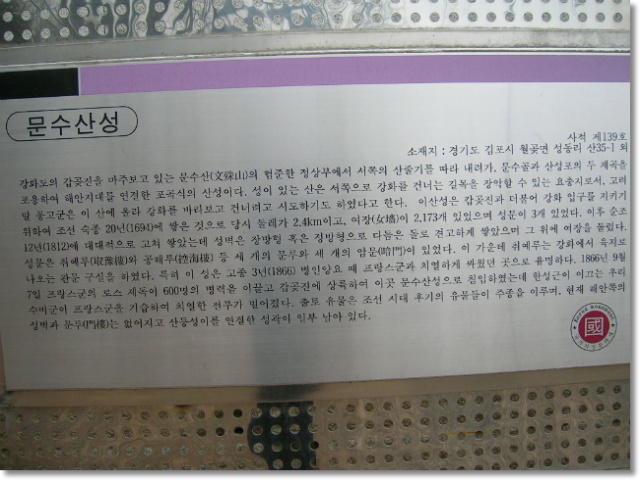 문수산성 控海樓(북문) 문수산성은 조선 숙종 22년에 축성되었다네요 병인양요 때 주요 건물들은 모두 소실되었는데 최근에 많이 복원을 했다는게 이 정도 입니다 주변 환경이 열악합니다 이 나마 최근 관심이 높아졌기에 이 정도 개보수가 이루어 졌으리라~