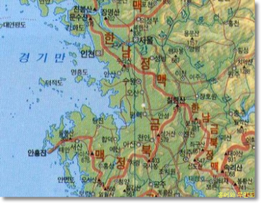 한남정맥 한남정맥은 백두대간의 속리산에서부터 안성의 안성 칸트리 클럽의 뒷산 칠현산까지 '한남금북정맥'을 이루고 거기서 북서쪽으로 문수산까지 뻗은 산줄기를 '한남정맥'이라 부릅니다. 한강 남쪽의 산줄기라 생각하시면 됩니다 칠현산에서 태안반도로 뻗은 산줄기가 금북정맥입니다.금강의 북쪽 산줄기라 생각 하면 됩니다