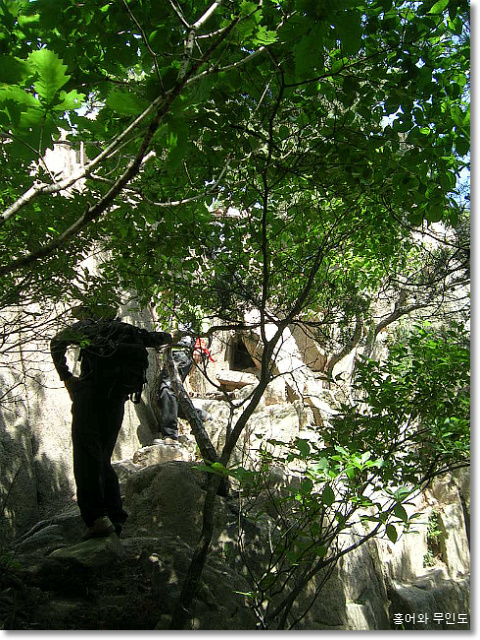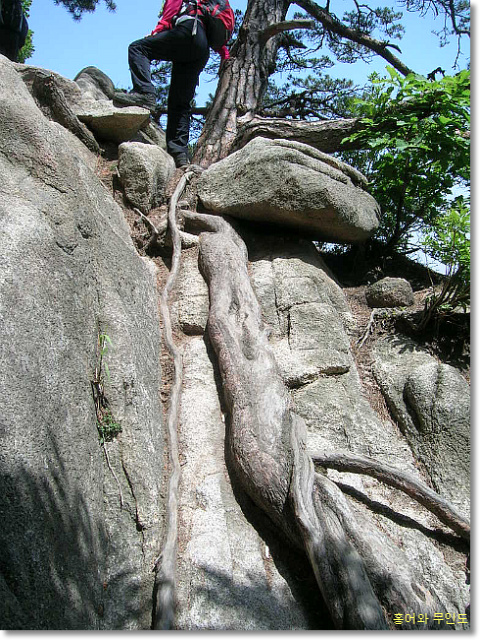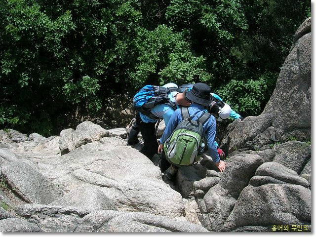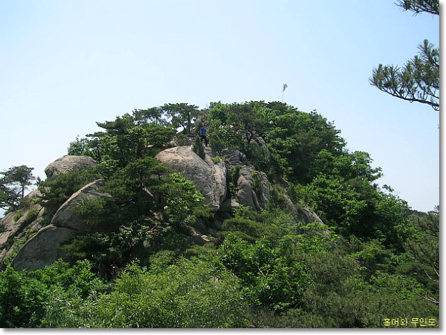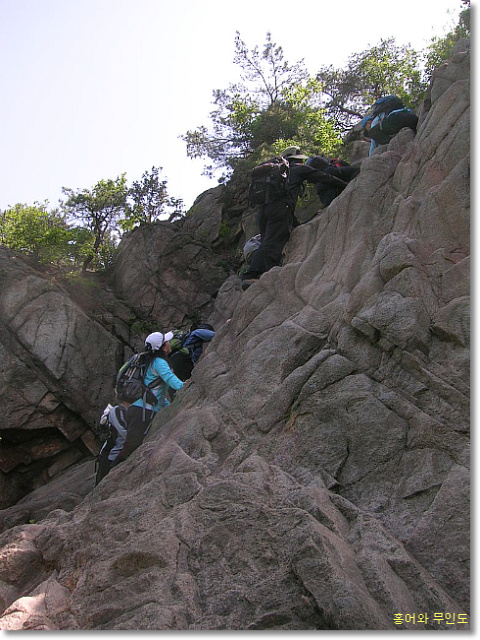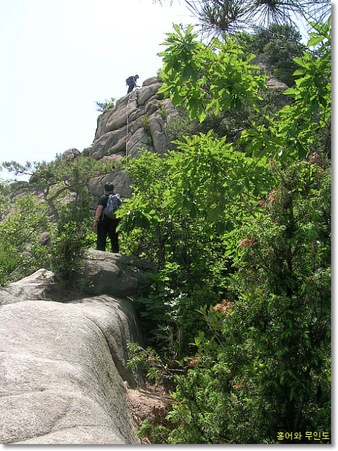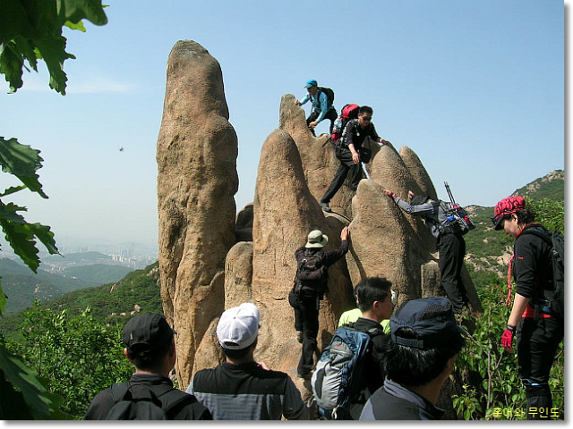 왕관바위에 더 가까이 갔더니 한무더기 젊은이들이 왕관에 서로 먼저 오르려하고 있었습니다