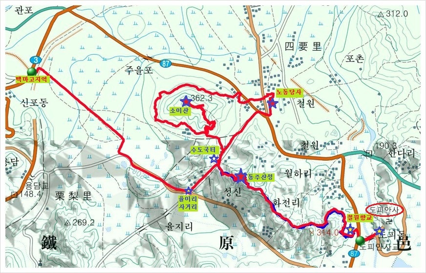 "백마고지역-노동당사-소이산-동주산성-도피안사"