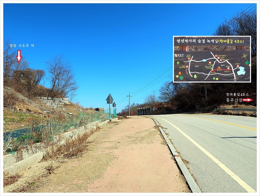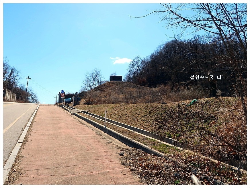고개 좌측엔 <철원수도국터>가 있으며 우측엔 <한여울길4코스> 입구가 있는데