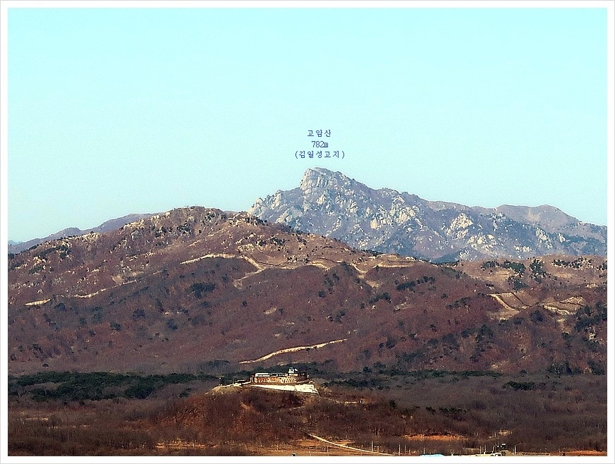 <월정리역> 뒤로 북한의 <전승봉>과 그 뒤로 <백암산 1,104m >으로 추정되는 산군들이 보입니다.