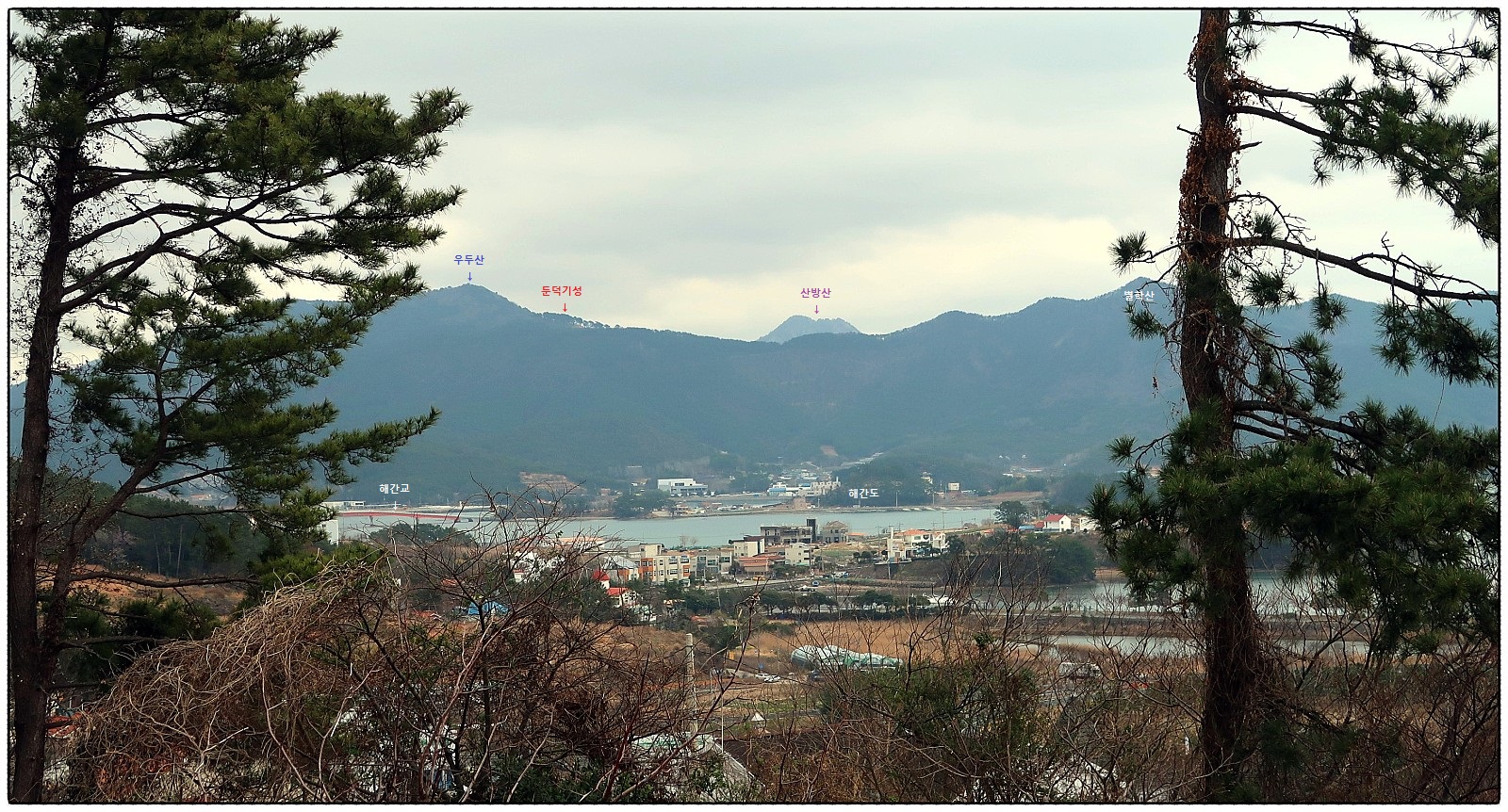 ['둔덕기성' 조망] ★ 사진을 클릭하면 확대 됨 ★ <견내량>에서 <한산도>로 이어지는 해협이 펼쳐지며 건너편엔 <거제도>가 맞닿아 있는데 지난 <27코스> 때에 올랐던 <둔덕기성>과 <산방산>이 조망됩니다. 이 사진 클릭하면 큰 화면으로 실감나게 볼수 있습니다.