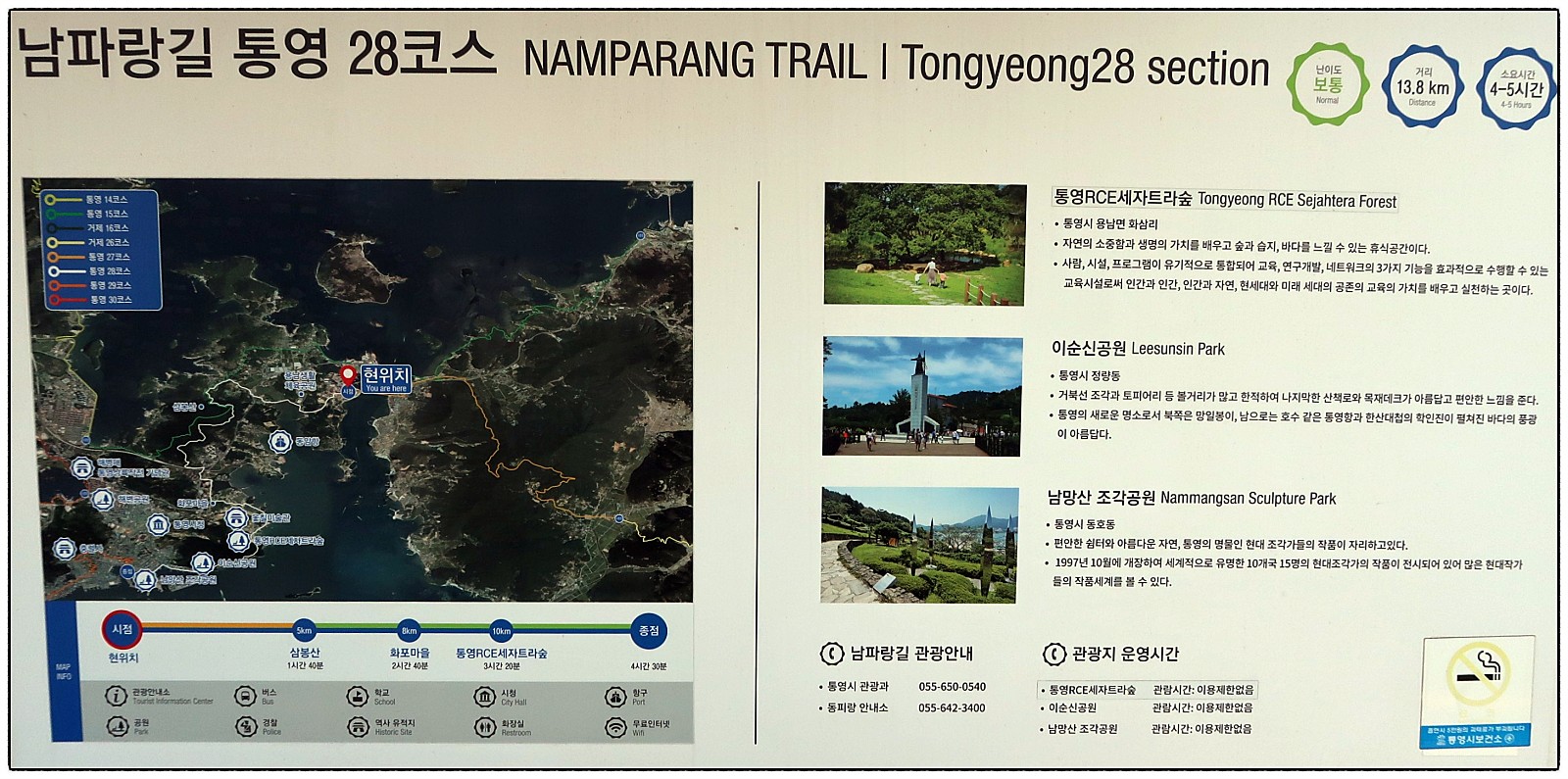 『남파랑길 28코스』 한산대첩과 이순신,박경리와 김약국의 딸들 현장 삼화삼거리-삼봉산자락길-세자트라숲-이순신공원-유치환생가- 남망산-통새미-동피랑-세병관-간창골우물-박경리생가-충렬사['남파랑길28코스 안내도'] ★사진을 클릭하면 확대 됨★ <남파랑길 28코스>는 <신촌마을버스정류장>부터 <남망산조각공원>까지 입니다만 편의상 <신존마을버스정류장>에서 <삼화삼거리>까지는 지난번 <27코스>에서 미리 진행하여 생략하고 오늘은 <삼화삼거리>에서 출발하여 <남망산조각공원>까지 가서, 추가로 <29코스>의 일부인 <통영>의 <동피랑>과 <통제영>을 답사하고 <충렬사>까지 갑니다.