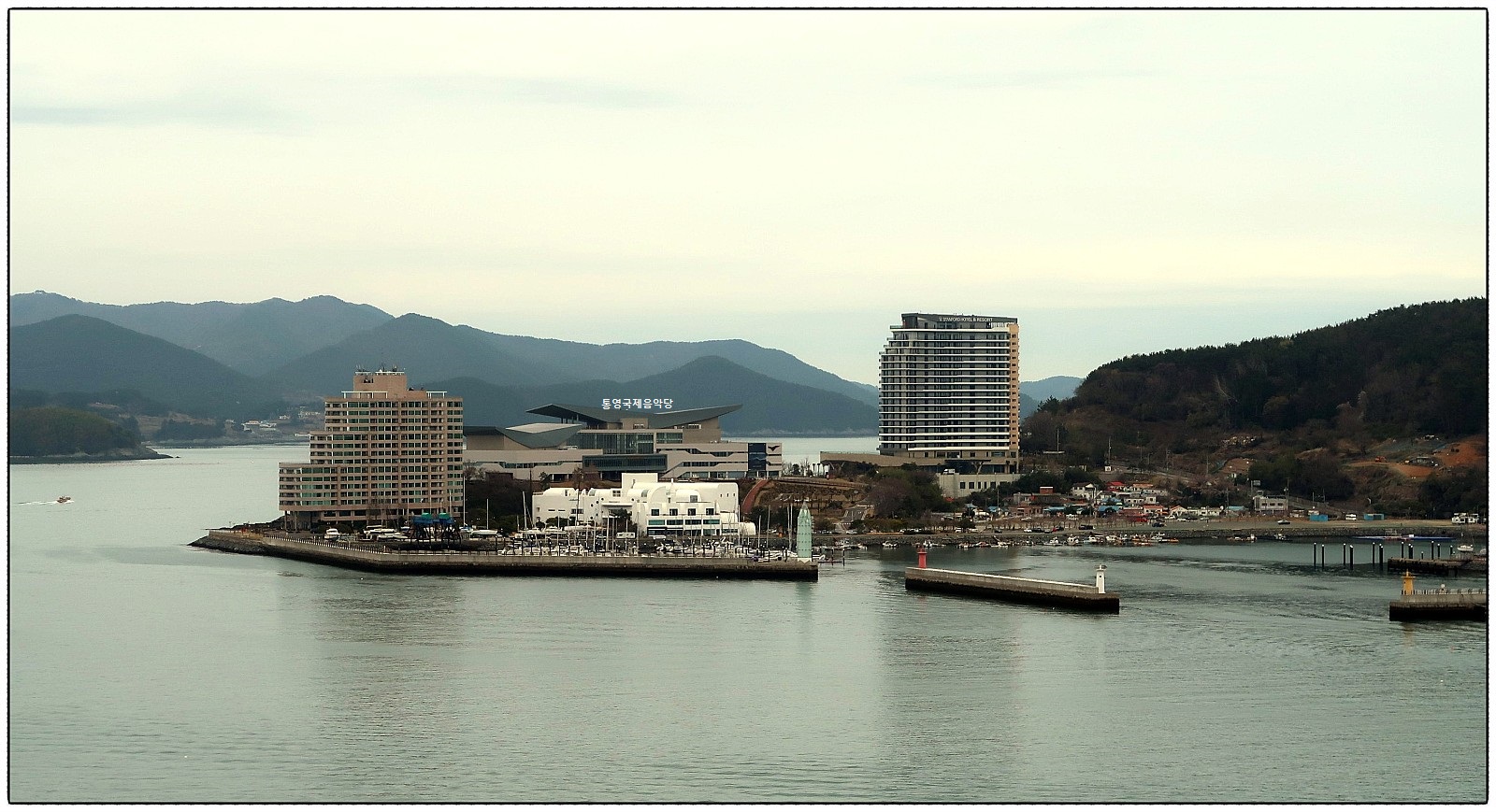 [조망] ★ 사진을 클릭하면 확대 됨 ★ 설명이 필요없는 뷰 입니다. 사진을 클릭하면 <통영>이 낳은 세계적 음악가인 <윤이상선생>의 음악세계를 기리는 "통영국제음악당"의 전경을 크게 확인할수 있습니다. 음악당 좌우에 있는 큰 건물은 리조트랍니다. 호주 시드니의 오페라하우스와 견줄수 있을 정도라 하며, 한국의 나폴리라는 명성에 걸맞는 음악당이라 합니다.