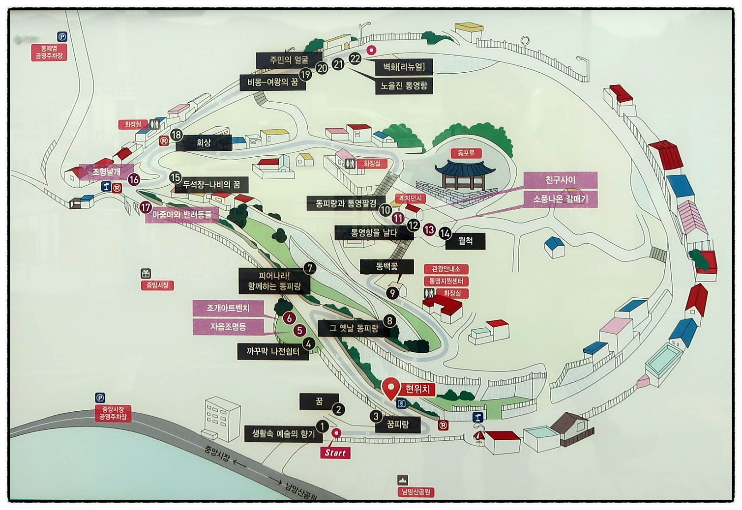 ['동피랑' 안내도] ★ 사진을 클릭하면 확대 됨 ★ "피랑"이라는 말은 깅상도 사투리로 "벼랑"을 의미하죠. 가파른 벼랑에 있는 마을이라는 의미인데 해발 50m도 않되는 조그만 동산이니 그렇게 힘들지는 않고