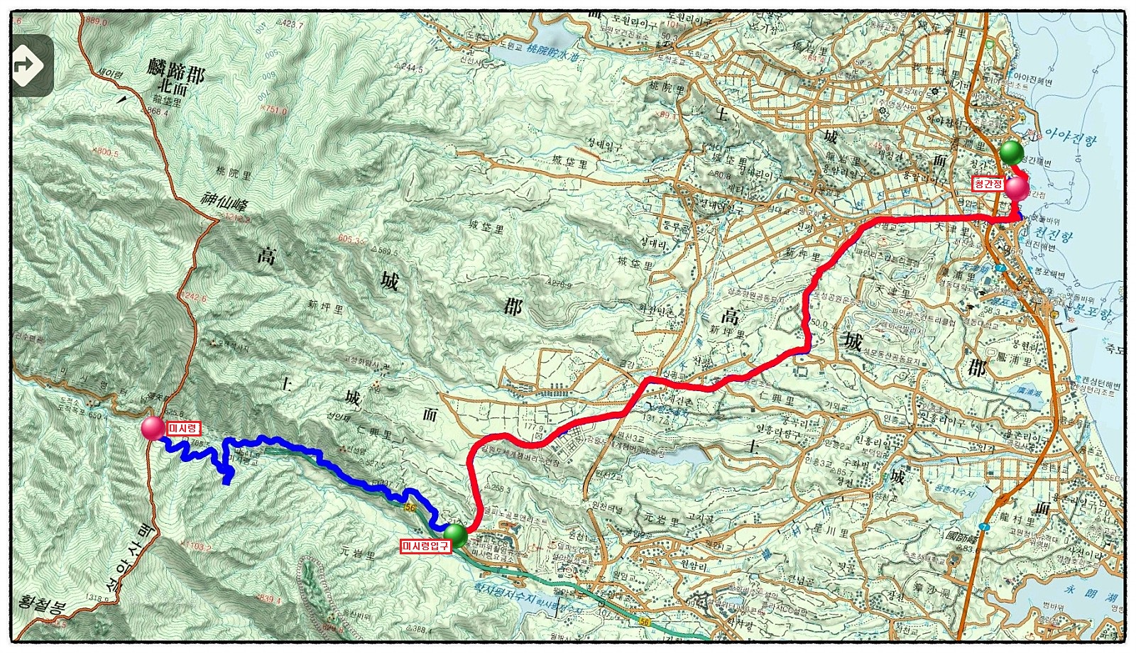 ['16코스' 실트랙 지도] ★사진을 클릭하면 확대 됨★ 오늘이 4월 하순인데도 "미시령 옛길"은 지난 겨울 폭설로 낙석위험이 있다고 4월말까지 폐쇠한다고 해서 지도에 파란색으로 표기된 <미시령 옛길>은 생략하고 <미시령 옛길 입구>에서 <청간정>까지만 답사했습니다.