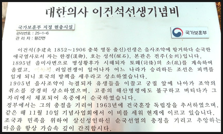 <영동군>의 자존심을 지킨 애국지사 <이건석선생 기념비>가 세워져 있다