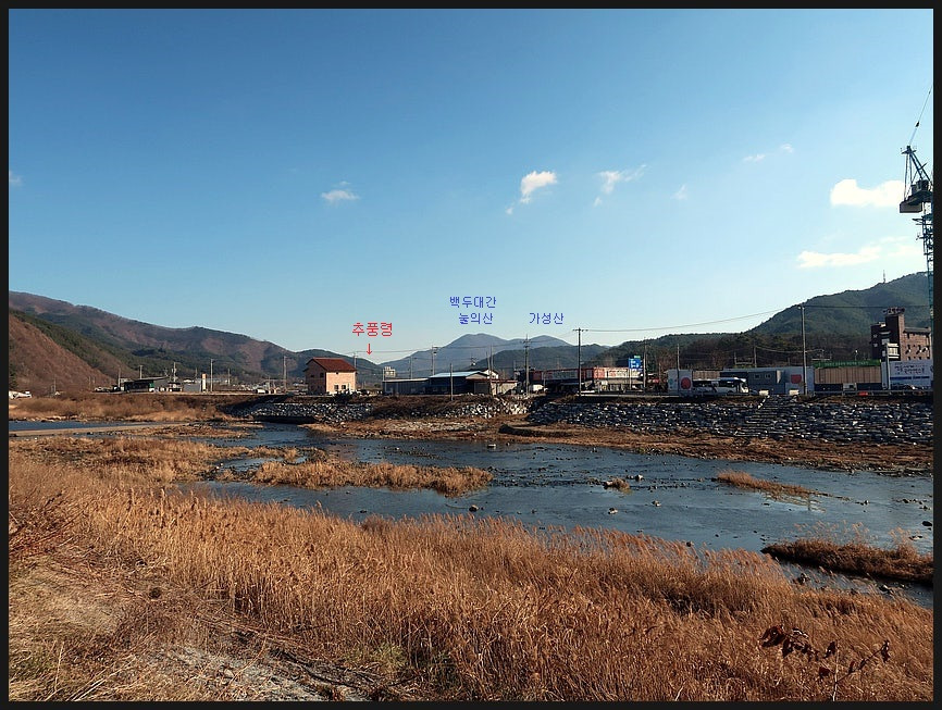 <초강천>이 흘러 오는 남쪽 방향으로 <황간읍내>가 조망되며 그 뒤로 <추풍령>이 아련하다.