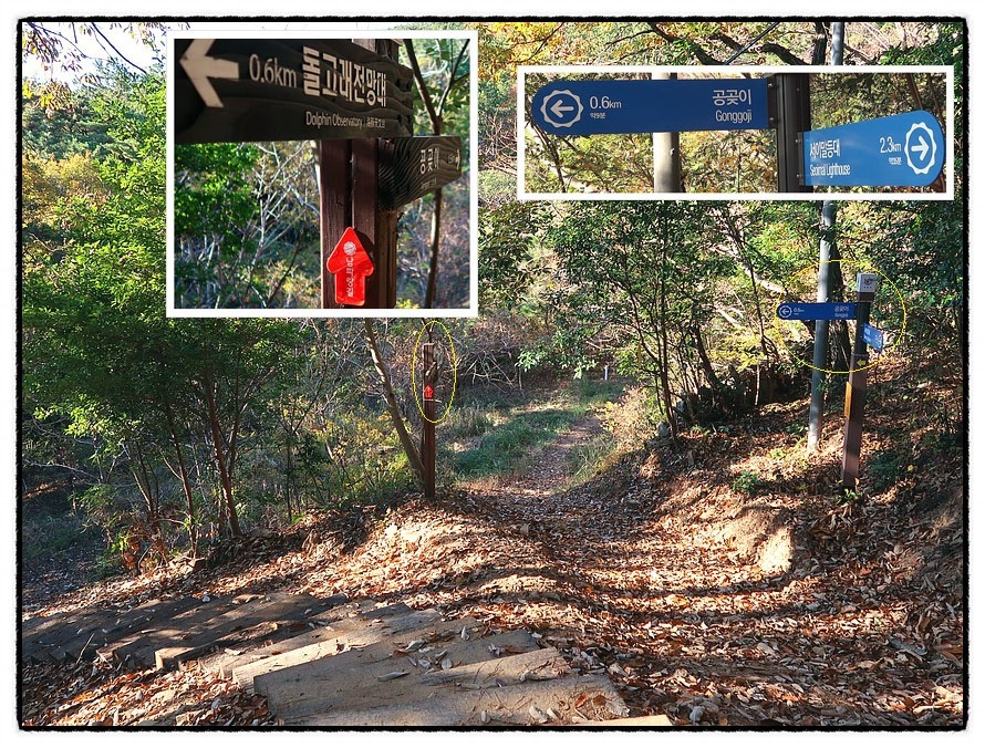 [삼거리] 3:16 . 이정표가 두개나 있는 삼거리를 만나는데 <해파랑길>은 직진하라고 알려 줍니다. 그런데 이정표엔 좌측으로 600m 가면 <공곶이>라고 알리는데 아마 좌측으로 가도 <공곶이>로 가는가 봅니다.