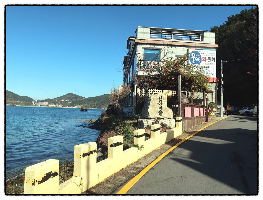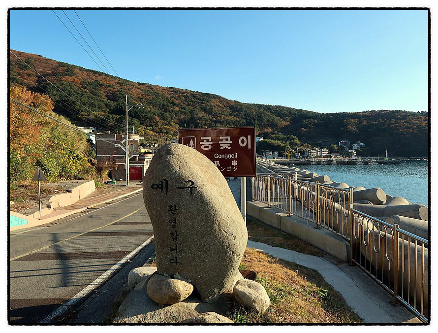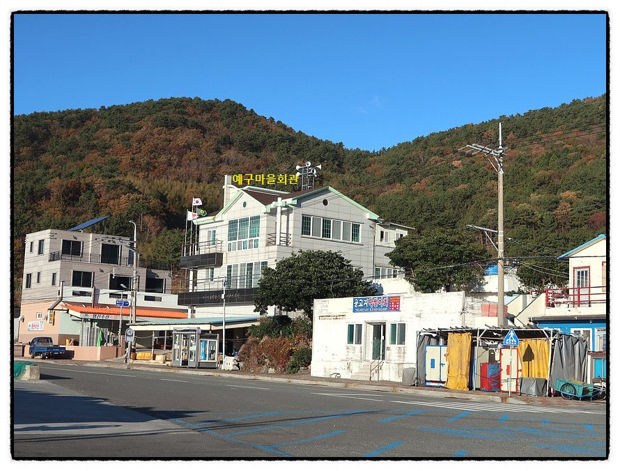 ['예구마을회관'] 3:48 "예구마을"을 만납니다. <예구마을>이란 지명의 유래는 찾아 보기 어려웠습니다만 고생 끝에 찾았습니다. 어원은 "왜구미 倭仇味"에서 유래하다고 하는데 <왜기미→예기미>로 변화하고 표기상 <예구>가 되었다는데 <쪽바리 왜倭>와 <원수 구仇>로 한자 표기했답니다. 원래 일제강점기 시절 "일본 예인선이 정박하던 곳"이라 합니다. 현재는 바다낚시로 무지 유명하다는군요.