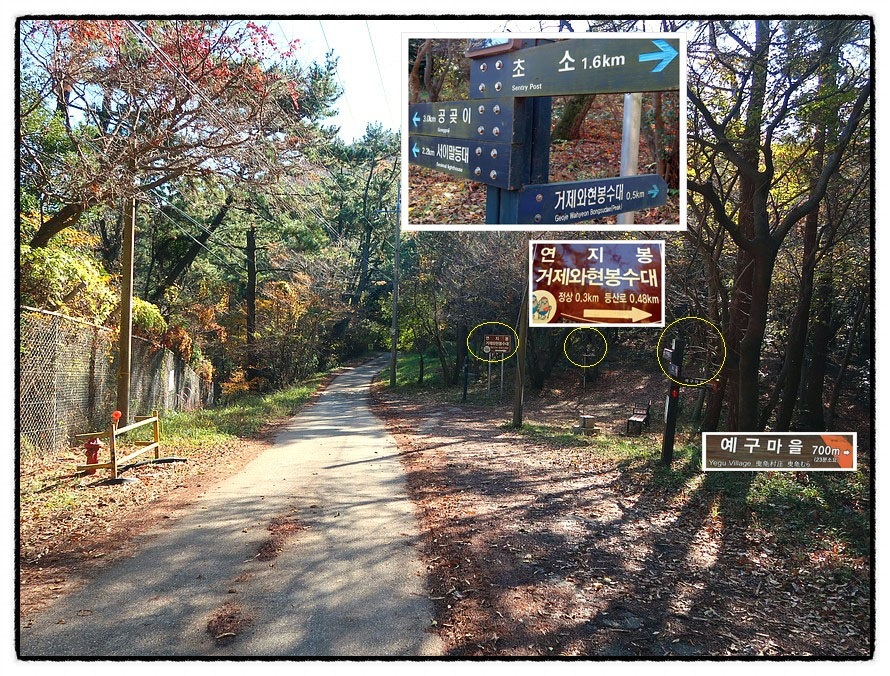 ['거제와현봉수대' 갈림길] 1:53 "거제 와현봉수대 갈림길"을 만납니다. 안내판에는 <연지봉>이라고 합니다만, 모든 지도에는 <망산 望山>이라고 표기하고 있습니다. <거제도>엔 <망산>이 여러곳 있군요. 또한 이곳은 <예구마을>로 바로 통하는 곳이기도 하더군요 <와현봉수대>는 조망이 빼어난 곳이라고 알려져 있어 힘들더라도 꼭 다녀 오겠다고 미리 계획을 세웠기에 다녀 오기로 합니다.