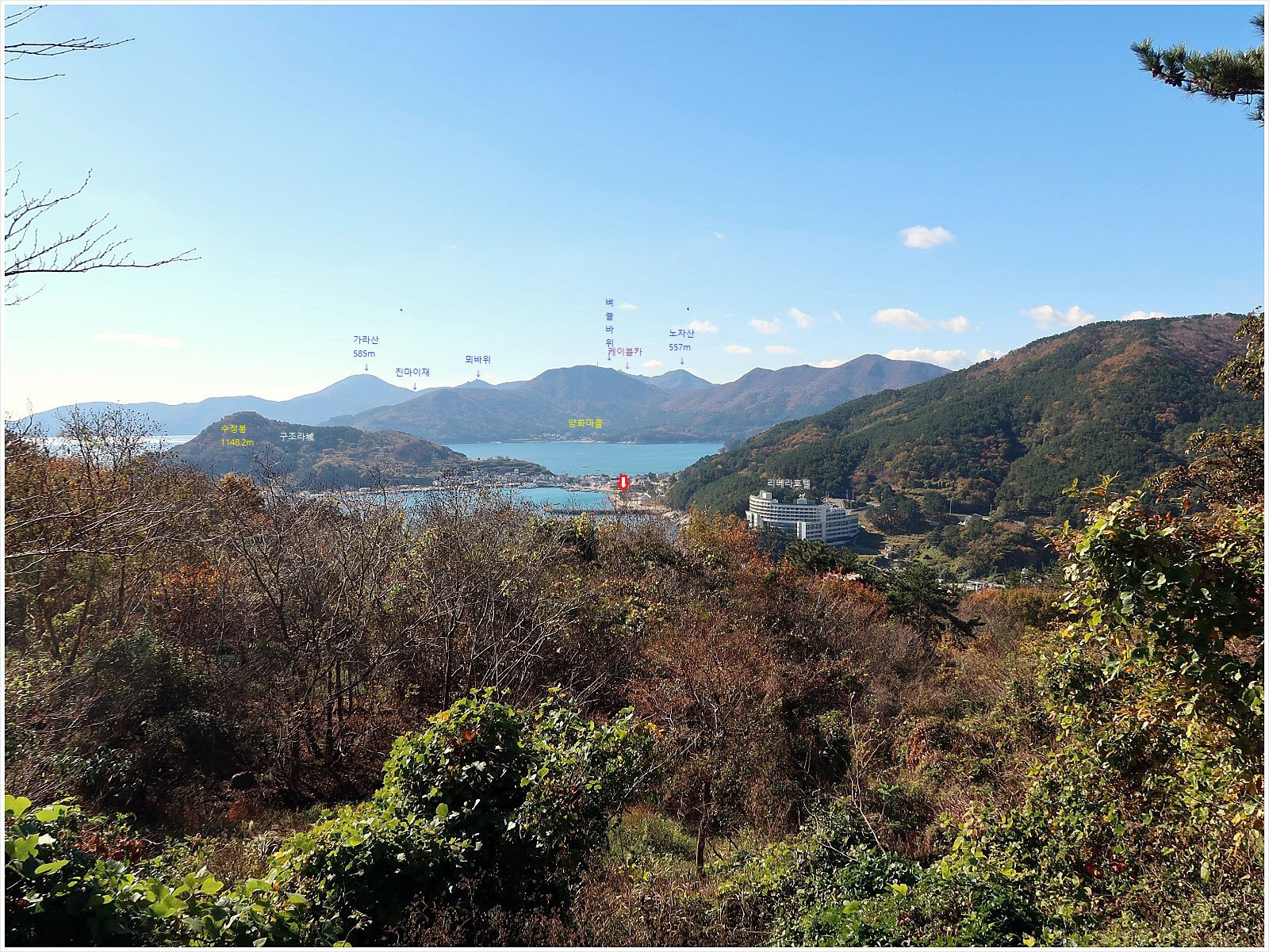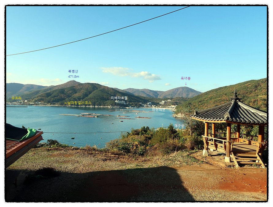 ['구조라성' 조망] ★ 사진을 클릭하고 한번 더클릭 하면 크게 확대 됩니다 ★ 오늘 종점인 <구조라>와 다음에 진행할 코스들이 파노라마로 펼쳐집니다. 가운데 보이는 건물이 <리베라호텔>인데, 더 자세한 안내는 사진을 클릭하여 확대된 사진을 참고 하고 확대 된 사진 속에 자세한 지명을 표기했으며, 다다음 코스인 <가라산>과 케이블카가 운행되는 <노자산>까지 알수 있습니다. 꼭 클릭 해 보고 가세요~~ 제가 심혈을 기울여 편집한 사진입니다. 또한 이곳 앞에는 <예구마을>로 바로 내려 가는 샛길이 있더군요.
