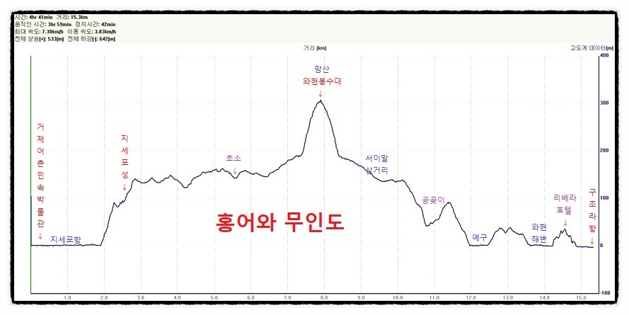[고도표] 오늘 걸은 거리는 <와현봉수대>를 다녀와서 15.4km였으며, 4시간 40분 정도가 걸렸습니다. <진시황>의 명을 받아 <불노초>를 찾기 위해 우리나라로 왔던 <서불(서복)>의 흔적을 찾아보며 <한려해상국립공원 거제지역>을 감상한 <거제도 구간> 최고의 코스였습니다.