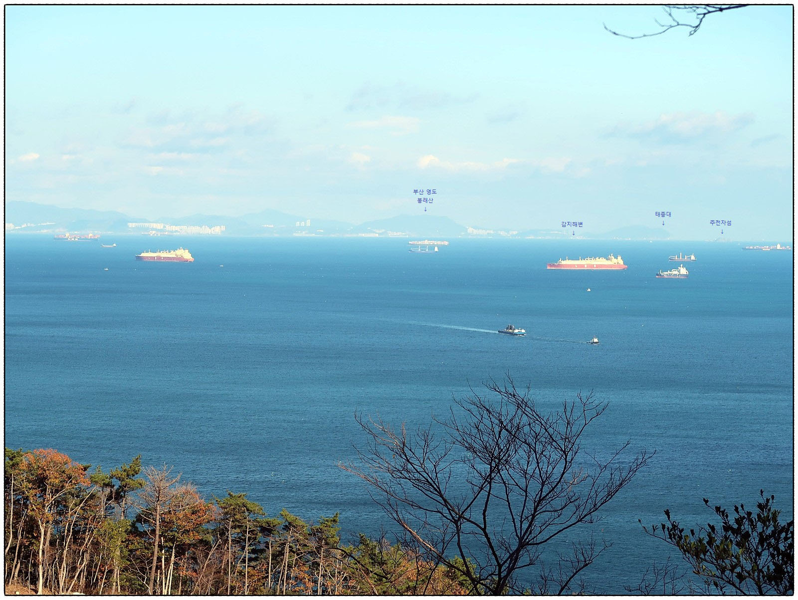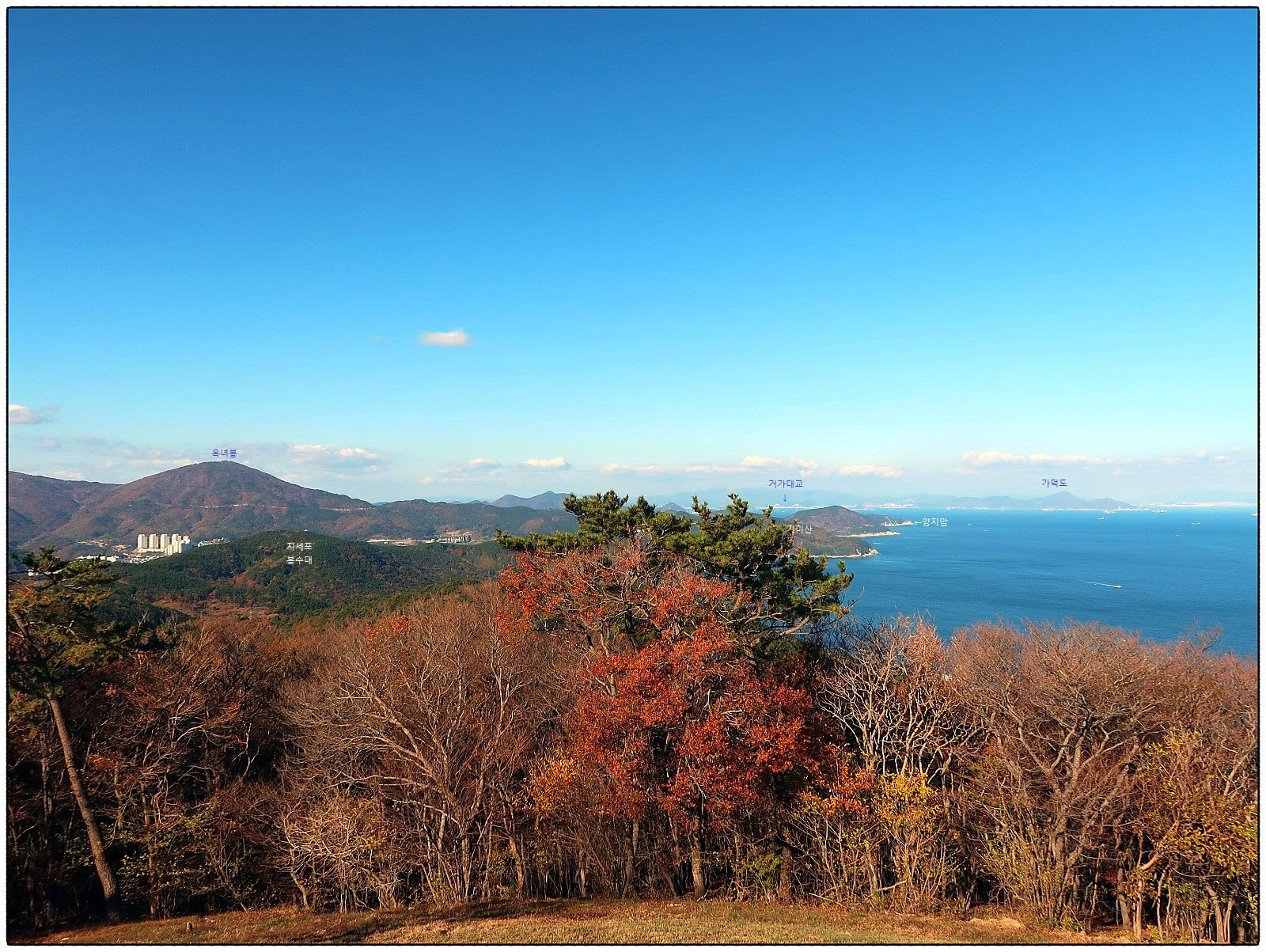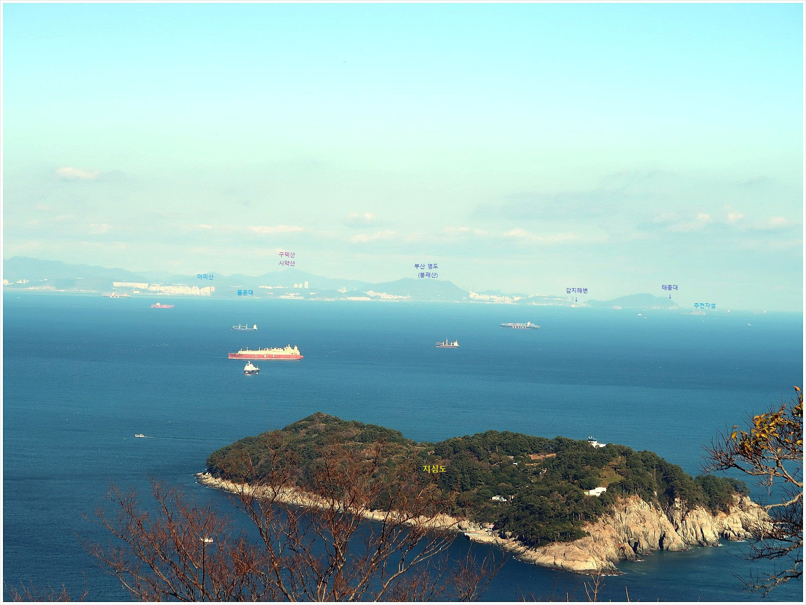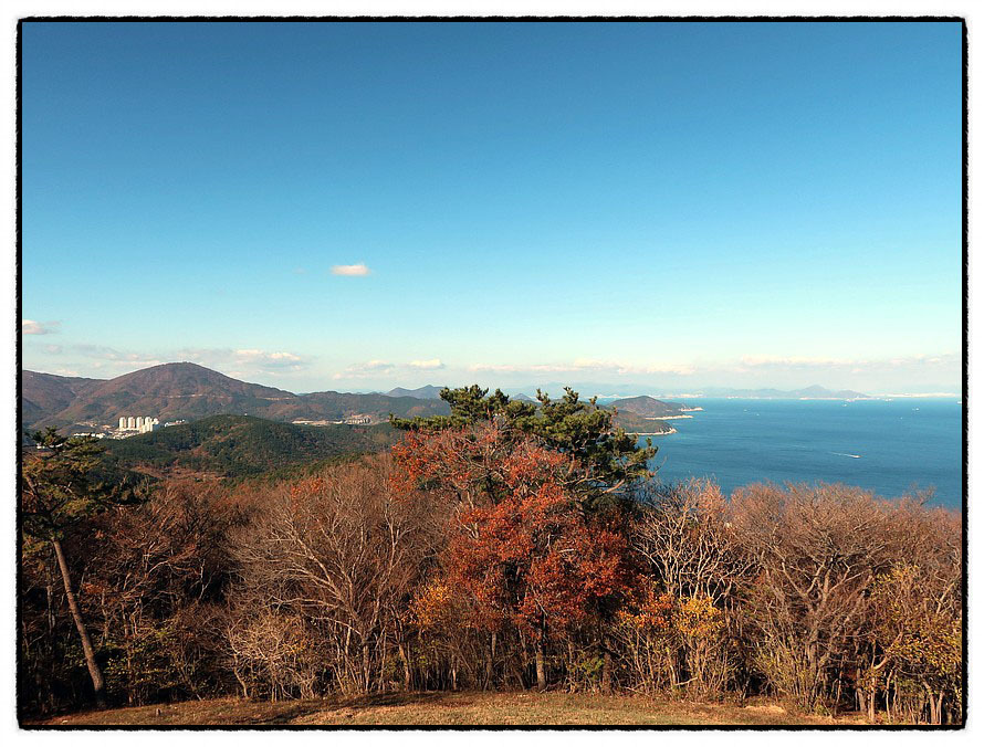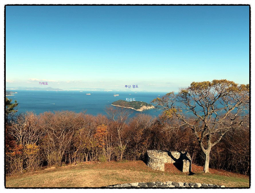 [조망 3] ★ 사진을 클릭하고 한번 더 클릭하면 크게 확대 됩니다 ★ 북동쪽으로 고개를 돌리면 <지심도>와 <가덕도>, 그리고 <부산 영도>까지 일사천리로 조망됩니다. 사진을 클릭하면 <부산 태종대> 앞에 있는 "주전자섬"까지 선명하게 보이며 <낙동정맥>의 끝인 "몰운대"와 <다대포>까지 잘 보입니다. 꼭 클릭 해 보세요