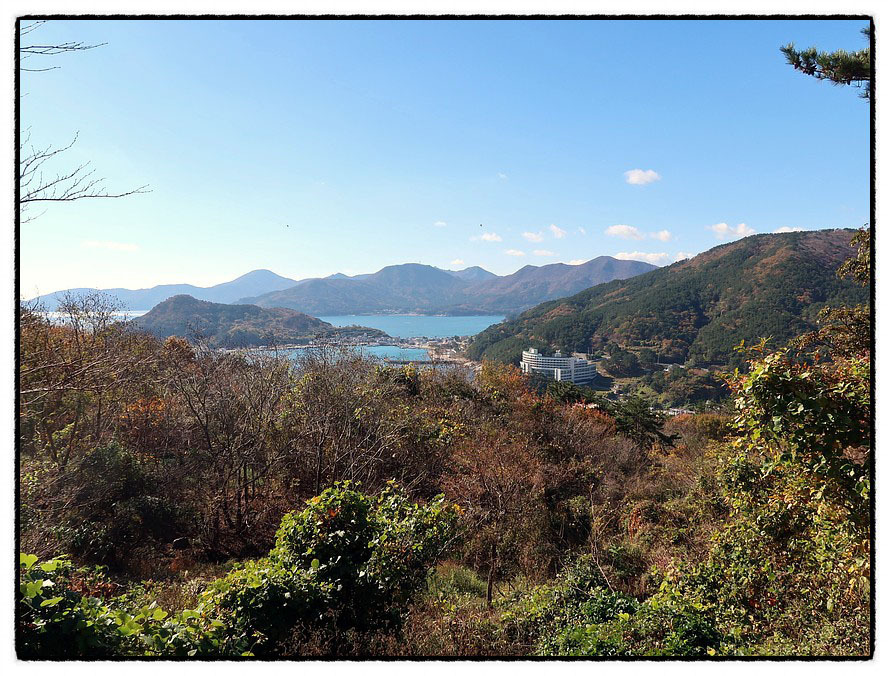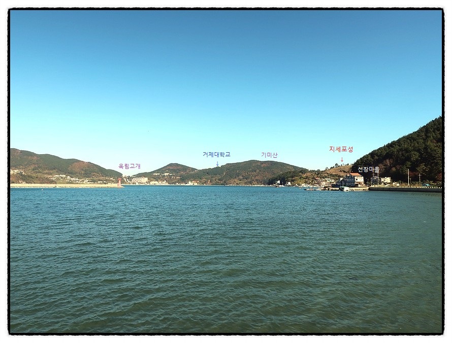 ['지세포항' 조망] <지세포灣>을 조망합니다. 지난 <20코스>에서 지났던 <거제대학교>와 <기미산>이 추억으로 남으며, 우측에는 잠시후 오를 <지세포城>이 보이는데...... 여기서 보니 <지세포灣>은 바다가 아니라 하나의 "호수" 같군요.