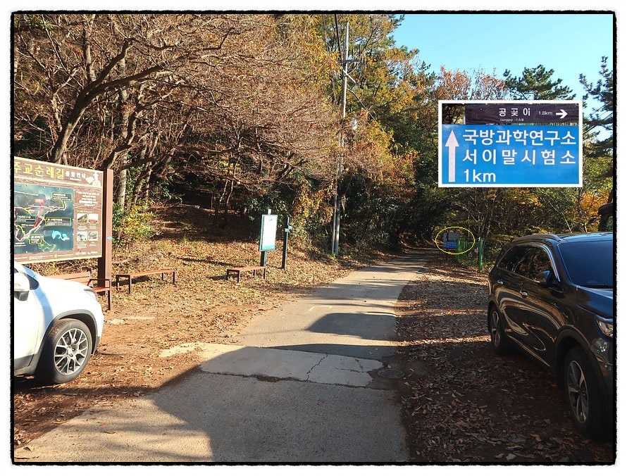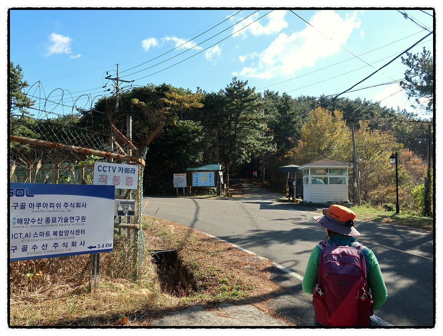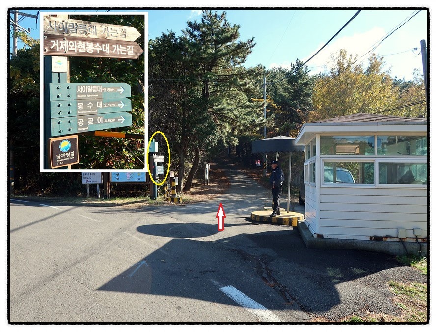 ['공곶이' 갈림길] 2:57 이어서 "서이말등대-공곶이 갈림길" 삼거리를 만납니다. 여기서 부턴 좌측에 <국방과학연구소 서이말시험소>가 있군요. <서이말등대>까지는 왕복 2km나 되어 다녀 오기는 시간상 어려워 우측 <공곶이 방향>으로 바로 진행합니다.