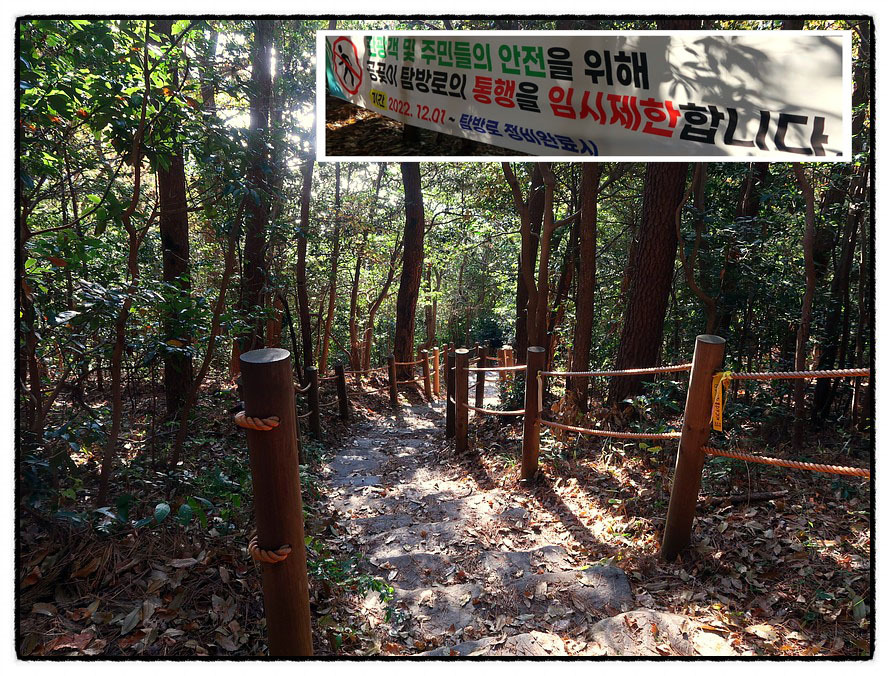 ['공곶이' 내림길] <공곶이>로 내려 가는 길입니다. 그런데 지난 여름 태풍 <흰남노>로 많은 피해를 입어 복구 중에 있다고 통행을 삼가해 달라고 하네요. 그리고 <두루누비> GPS트랙도 <공곶이>를 통과하지 않고 직진하여 <예구마을>로 가라고 합니다.