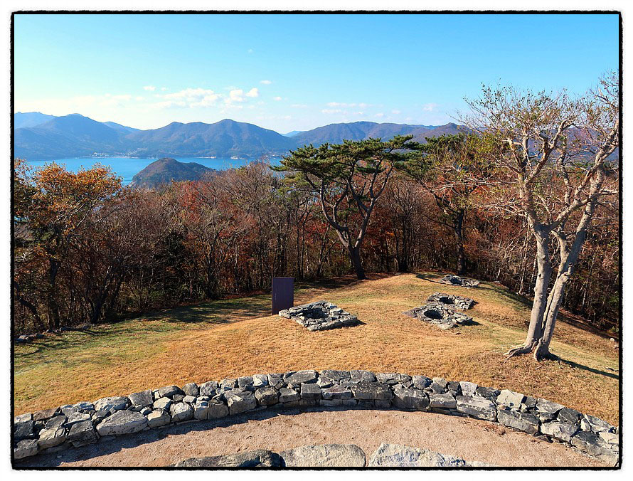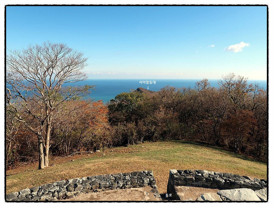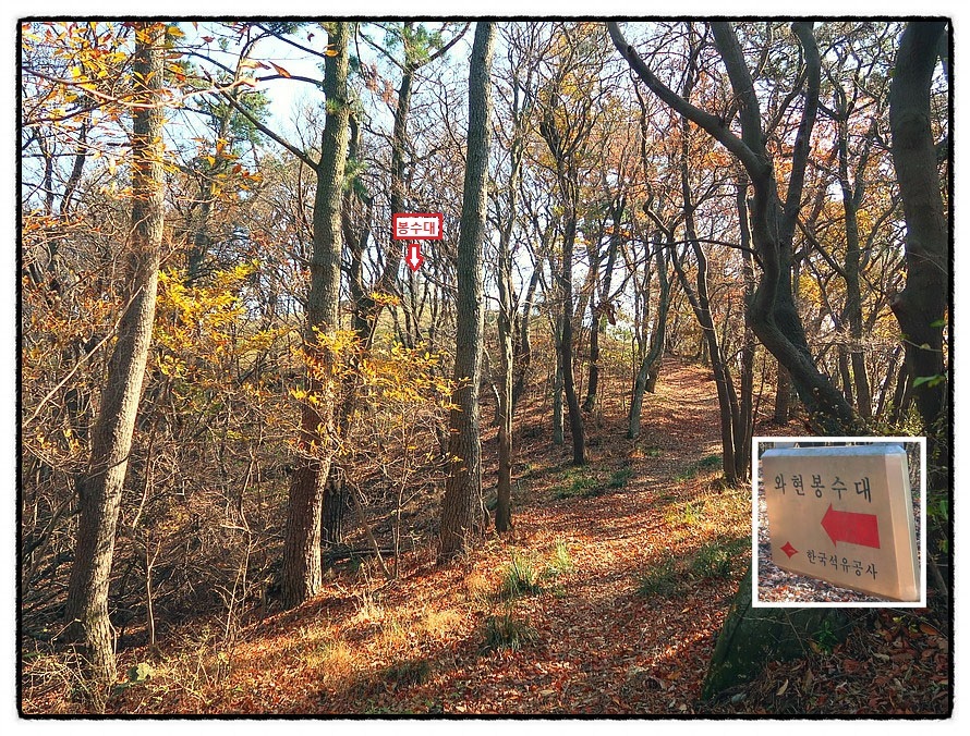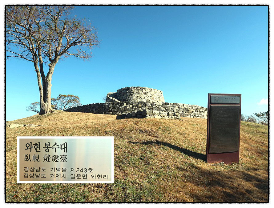['와현 봉수대'] <와현봉수대>에 대한 자세한 내용은 안내문에 나와 있는데 특이한 점은 이곳 봉수대에서 근무하던 봉수꾼들의 거처 흔적이 분명히 남아 있다는 것입니다. 봉수대에 올라 사위를 조망합니다.