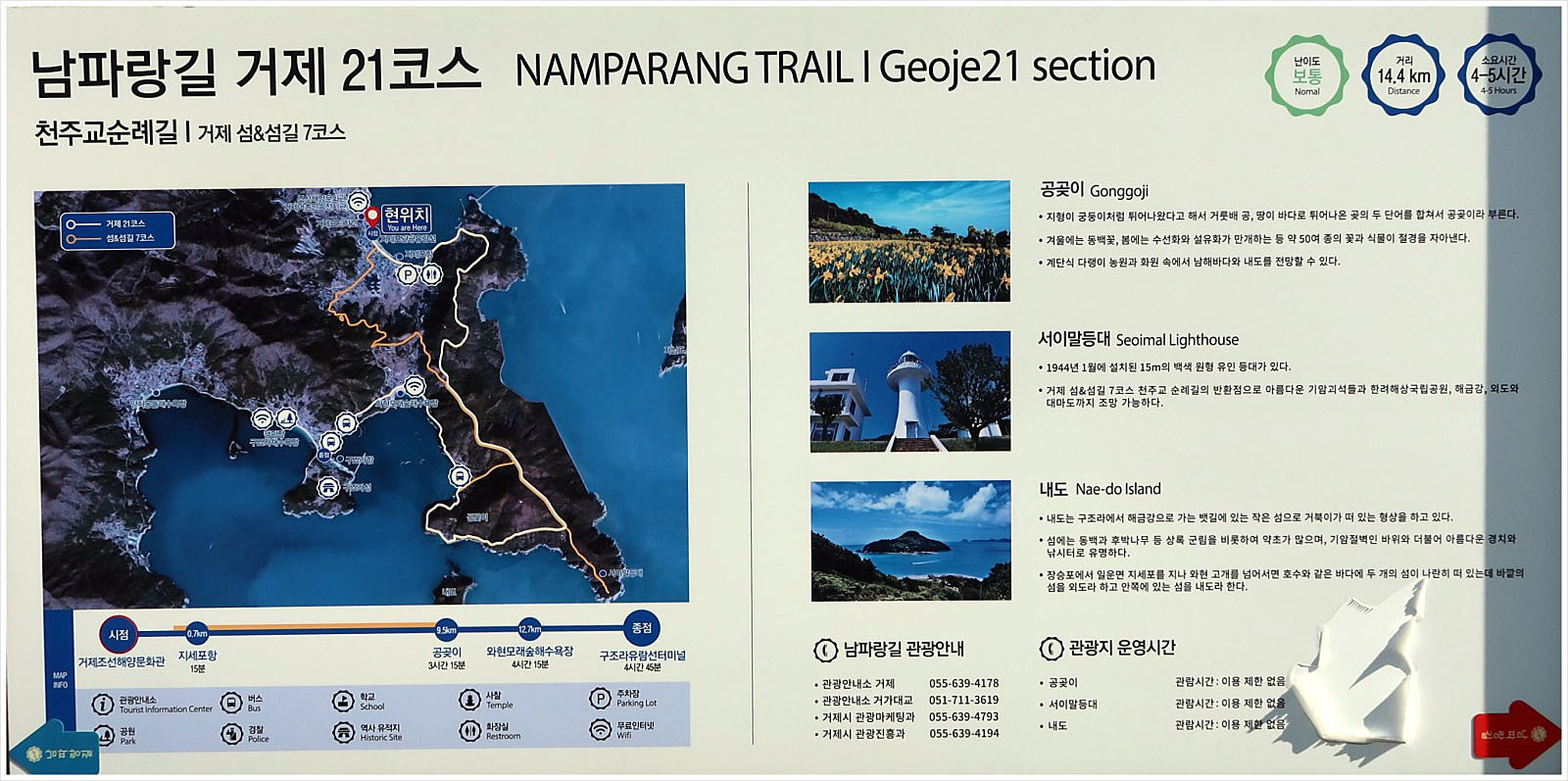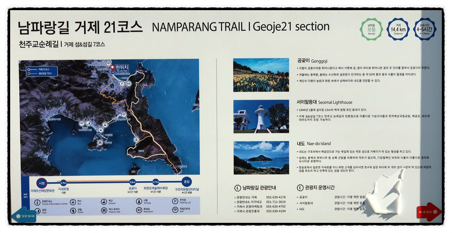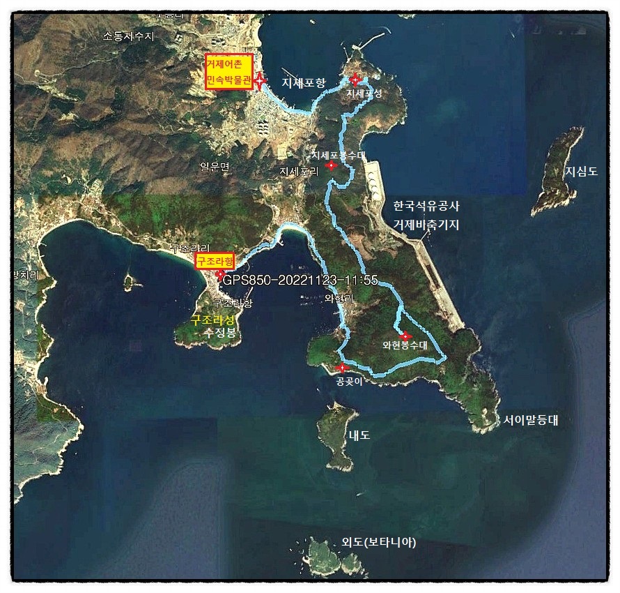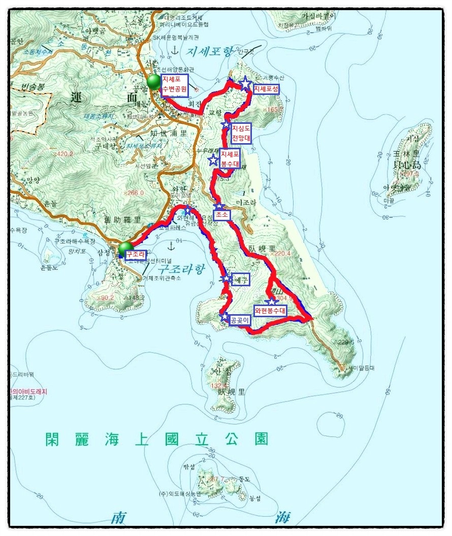 『남파랑길 21코스』 거제어촌민속전시관-지세포항-U2초소-와현봉수대- 공곶이-예구마을-와현모래숲해변-구조라수변공원['국토지리원지도 실트랙'] '경남 거제시 일운면 지세포리'에 있는 "거제어촌민속전시관"에서 출발하여 '경남 거제시 일운면 구조라리'에 있는 "구조라유람선터미널"까지 "15.4km"를 갑니다. 특히 이번 코스는 "한려해상국립공원 거제지역"이 시작 되는 곳으로 "지심도-서이말등대-공곶이-내도-외도-와현모래숲해변-구조라성-해금강-바람의 언덕" 등이 화려하게 조망되는 <거제도>에서 가장 아름다운 곳이라 여겨집니다.