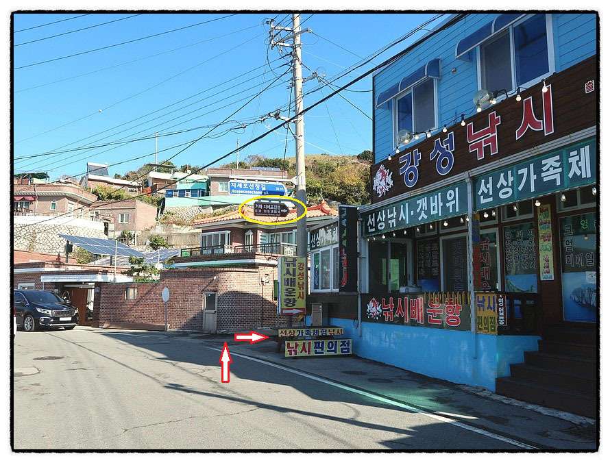 ['선창마을' 입구'] <선창마을> 입구에 있는 음식점과 카페를 지나가게 되고
