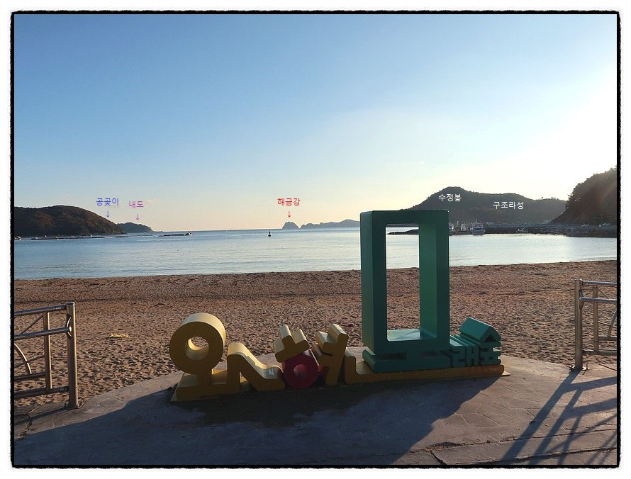 [조망] 4:16 <서불유숙지> 표지석 앞에 펼쳐지는 <와현모래숲해변> 앞의 뷰입니다. <서불>이 앞에 보이는 <해금강(갈도)>를 지날 때 <우제봉> 암벽에 <徐市過此>라는 글자를 새기고 풍랑이 거세게 일자 이곳 <와현해변>으로 피난 와 한동안 투숙했다는 것입니다.