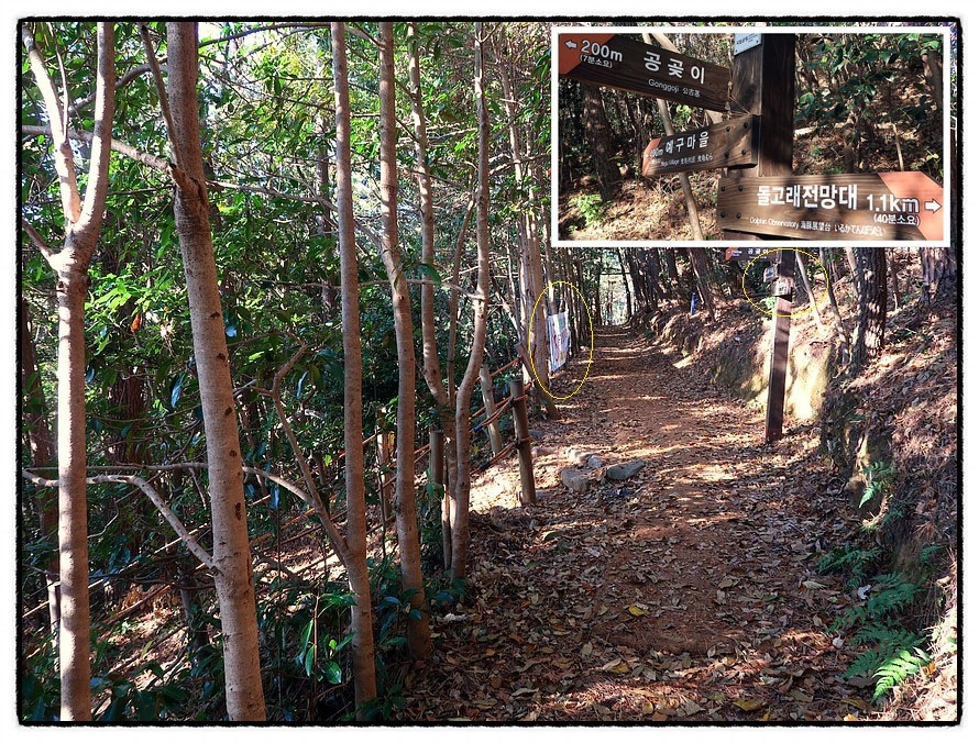 [공곶이' 갈림길] 3:30 . 다시 이정표가 있는 삼거리를 만나는데 좌측으로 내려 가면 200m 지점에 <공곶이>가 있다고 알려 줍니다.