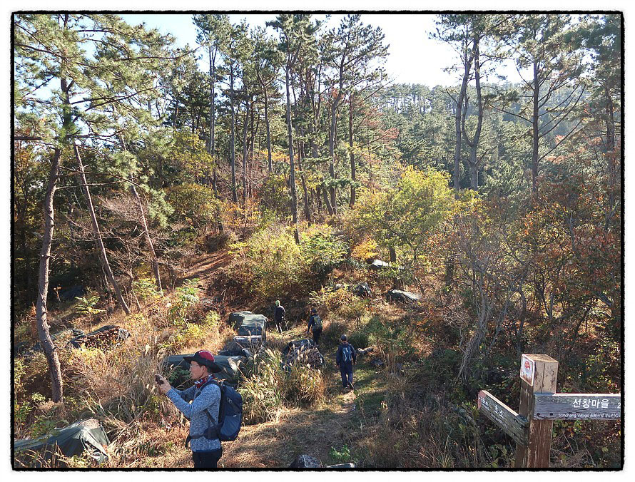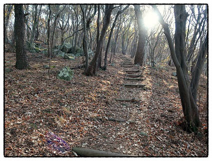 [봉수대 근무자 숙소 터] 서쪽으로는 올라 왔던 길이 보이는데 이곳에 근무하던 봉수꾼들의 숙소가 있었던 터를 복원해 놨군요. 조망을 마치고 아이디 <나리님>이 준비해 온 주먹밥과 홍시로 예상치 못한 후한 대접을 받고 하산 합니다.