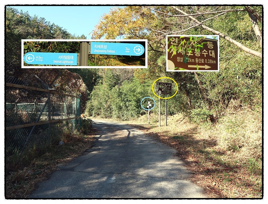 [임도] <지세포봉수대 입구>에서부턴 좌측에 철조망 울타리가 계속해서 <서이말등대 삼거리>까지 이어지는데, 이 울타리는 "한국석유공사 거제비축기지" 울타리인데 잠시후 자세히 알아 보겠습니다. 우측 <지세포봉수대>가 있는 <연지봉>이라는 산봉우리를 끼고 이어지는 임도를 20여분 진행하면