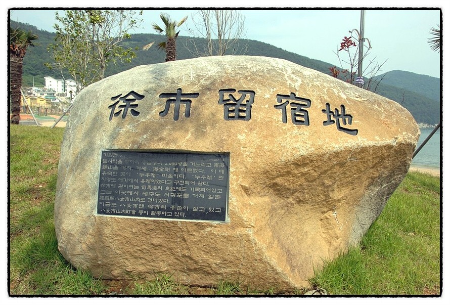 ['서불유숙지' 표지석] "서불유숙지 徐市留宿地" 표지석 "서불"이 <해금강>을 지날 때 풍랑을 만나 이곳으로 피난 와서 투숙했다는 표지석을 세워 놨습니다. 관심 가지고 미리 공부하고 가지 않으면 바로 옆인데도 모르고 지나칩니다. 중국, 한국, 일본의 <서불연구학술팀>들이 여러번 이곳에 모여 각국의 자료와 유적에 대한 학술회를 <리베라호텔>에서 열었다고 합니다. 한국을 방문 한 <서불>은 그후 일본으로 건너가 주저 앉아 살았다는데, <서불>의 후손들이 아직도 대를 이어 가며 살고 있다고 하네요. 그들의 성이 <일본 서徐>씨.... "서불의 존재는 분명 해 보입니다"