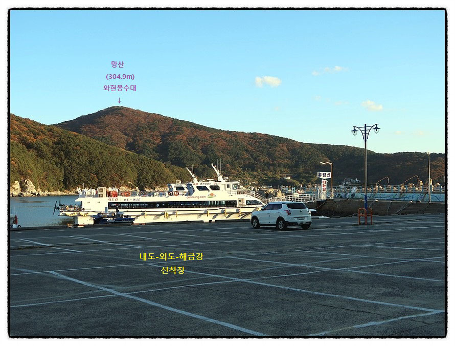 ['와현 봉수대' 조망] 두시간 전에 올라 <한려해상국립공원 거제지역>의 아름다운 뷰를 조망했던 "와현봉수대"가 또 올라 가고 싶게 유혹합니다. 또한 선착장에는 유람선이 <해금강>으로 가라고 꼬시는군요.