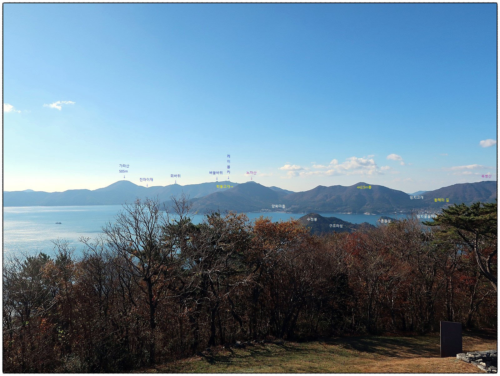 [조망 6] 매우 중요한 사진 ★ 사진을 클릭하면 크게 확대 됩니다 ★ 남서쪽을 바라보면 오늘의 종점인 <구조라>가 조망되며 그 뒤로 다다음 코스에 오를 <가라산>이 조망 됩니다. 자세한 사항은 사진을 클릭하면 상세한 지명이 안내되니 꼭 클릭 해 보고 가세요~~