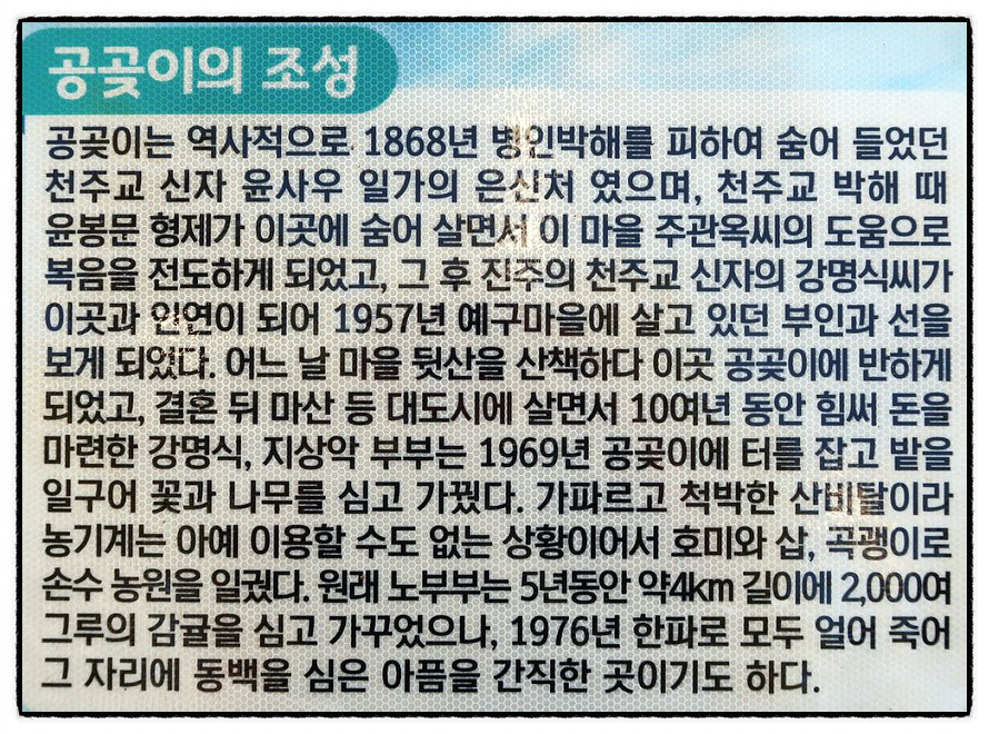 ['공곶이 주차장'] 3:33 이어서 <공곶이 주차장>을 만나며 안내판이 두개 설치되 있습니다. "공곶이"라는 지명은 "궁둥이 모양의 지형"에서 유래 한다고 거의 모든 안내서에 나와 있습니다. 그런데 <천주교순례길 안내도>에는 한자로 <公古基>라고 표기하고 있어 자세히 알아 보겠습니다 제가 조사 한 바로는 <공곶이>는 한자로 "고곶 股串"인데 음운변화와 사투리가 섞여 <공곶이>가 되었다고 하는게 가장 믿음이 갑니다. 왜냐하면 <고관절 股關節>이라고 할때 <고 股>가 "궁둥이 뼈"를 말하지요. 그리고 <곶 串>은 육지가 바다로 돌출되 있는 부분을 의미하니까 "고곶 股串"이 음운변화로 <공곶이>가 되었다고 보는게 설득력이 더 있다고 보는 것입니다.