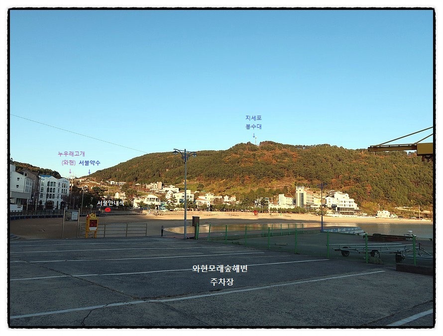 ['지세포 봉수대' 조망] <와현모래숲해수욕장>이 전체적으로 조망되며, 뒤로 <지세포 봉수대>가 있는 <연지봉>이 보입니다. 특히 주목 해야 할 곳은 "와현 臥峴 (누우래재)"입니다. <서불>이 이곳에 유숙할때 저 고개에 있는 약수터에서 물을 마시고 길게 누워 잣다는 전설이 있답니다. 그래서 약수터의 이름이 "서불약수터"이며, 현재도 <거제도>에서 최고의 약수터라는군요. 후답자들은 <서불유숙지 徐市留宿地> 표지석이 있는 위치도 참고 하시고...