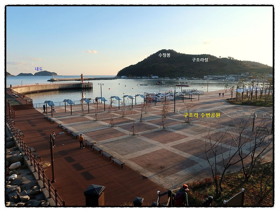 ['구조라수변공원'] 4:30 "구조라수변공원"에 도착합니다. 다음코스에 오를 <수정봉>과 <구조라城>을 바라보며 수변공원으로 내려 가면...