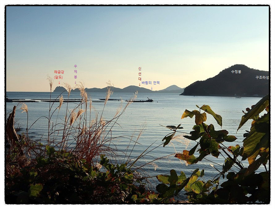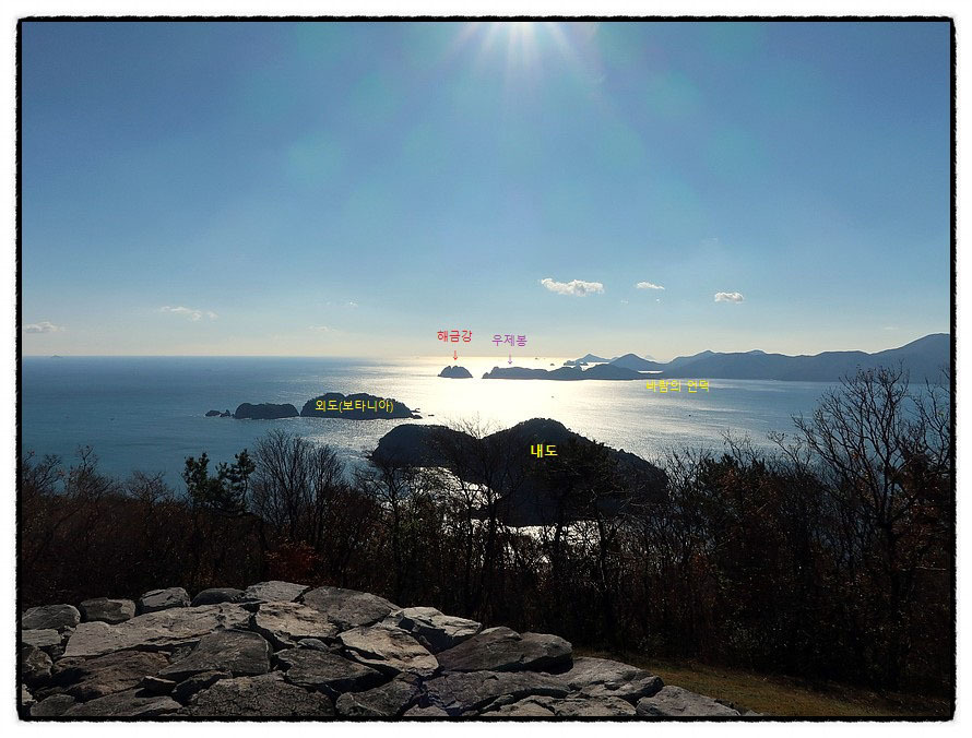 [조망 1] <와현봉수대>에 오르면 먼저 남쪽 "해금강 海金剛"과 "외도 보타니아"등 "한려해상공원 거제지역"이 역광 속에 신비롭기까지 하며 다가 옵니다. <와현봉수대>에 오르지 않고는 볼수 없는 귀한 경치입니다.