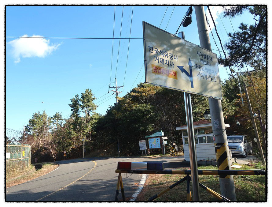 ['한국석유공사 거제지소' 입구] 사거리 우측으로 조금 갔더니 안내판에 <한국석유공사 거제지사> 입구라는걸 분명하게 알리고 있으며 <출입통제구역>이란걸 빨간 글씨로 경고하고 있으며, 안내판이 잘 보이지 않게 비스듬이 옆으로 돌려 놔서 의도적인지 자연적으로 돌아 간건지는 모르겠습니다. 국가 중요 시설인데... "한국석유공사 거제비축기지" <지세포봉수대>가 있는 <연지봉>에서 <와현봉수대>가 있는 <망산>, 그리고 <서이말등대>로 이어지는 산줄기 속에는 거대한 동굴을 만들어 비상시에 사용 할 석유를 비축하고 있답니다. 비축하고 있는 석유의 량은 약5,000만 배럴로 우리나라가 약 한달간 사용 할수 있는 량이랍니다. 이런 비축기지는 우리나라 여러 곳에 있다는군요.