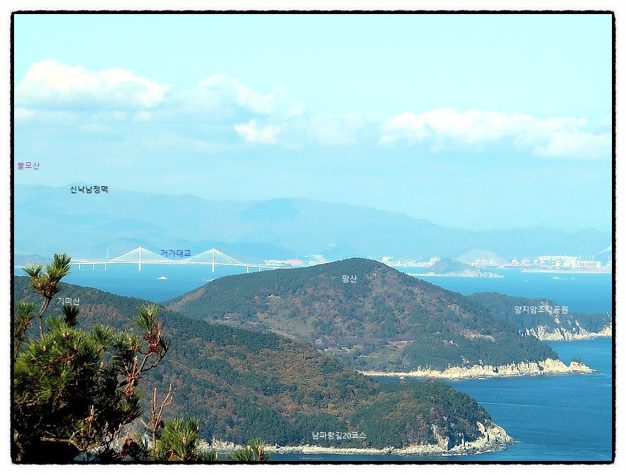 [조망 4] ★ 사진을 클릭하고 한번 더 클릭하면 크게 확대 됩니다 ★ 북쪽으로 방향을 바꾸면 지나온 <남파랑길> 발자취가 보입니다. <지세포봉수대>가 있는 <연지봉>과 계속 따라 다니던 <옥녀봉>, 그리고 <양지암>..... 멀리 <거가대교>와 <가덕도>까지 시원하게 조망되니 사진을 꼭 클릭 해 보고 가세요~~친절하죠? ㅎ
