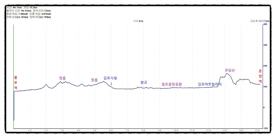 [고도표] 오늘 걸은 거리는 15km였으며 4시간이 걸렸습니다. 화려한 봄꽃이 만발하는 최적의 날에 <김포한강신도시>를 걸어서 구경하니 이렇게 벚꽃과 함께 하는 이런 날이 다시 올수 있을지 의문스러울 정도로 봄꽃과 함게한 감회 깊은 도보 여행이 되었습니다.