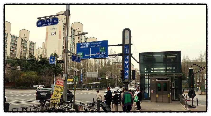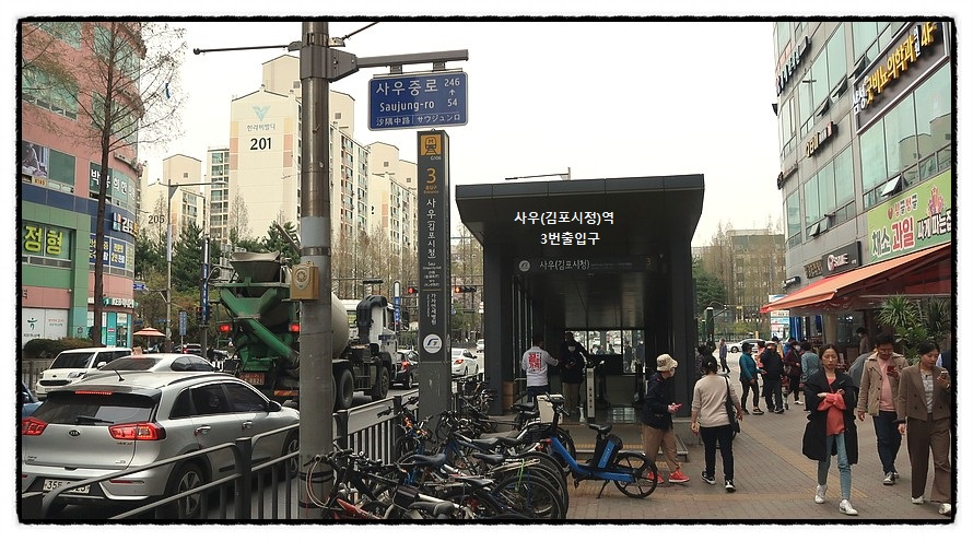 ['사우사거리'] 12:36 이어서 "사우(김포시청)역"과 "사우사거리"를 만납니다. "사우동 沙隅洞"은 '김포시'의 행정중심지랍니다. 지명의 유래는 "조수가 드나들던 한강변에 위치한 까닭에 개펄에 모래가 많이 쌓여 '모래모퉁이마을'이라 하였는데, 이를 한자화하여 사우리(沙隅里)라 한것이랍니다.