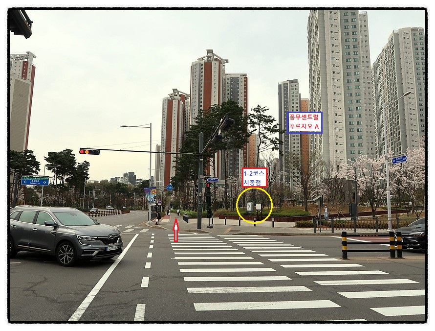['1-2코스 시종점'] 11:02 <트레이더스>에서 한 블록을 지나면 <풍무센트럴푸르지오아파트> 앞에 <새장터소공원>이 있고 이곳에 <강화길 1-2코스 시종점>이 있습니다.