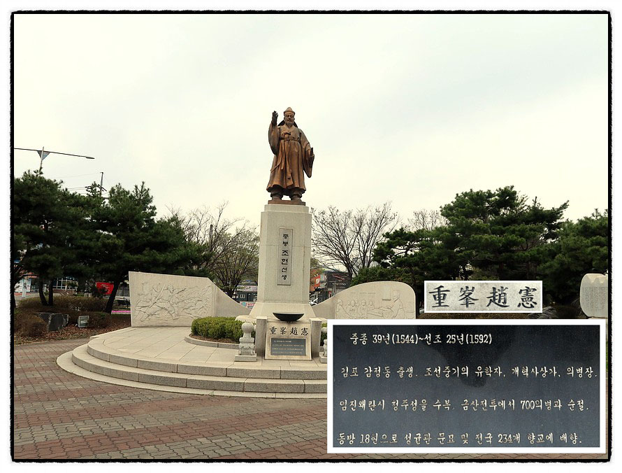 ['조헌' 동상] 12:46 이어서 <한국통신삼거리>를 만나는데, 삼거리 가운데에 "중봉 조헌선생의 동상"이 건립되 있습니다. <임진왜란> 때에 의병장으로 활약하다가 전사했다고 합니다.