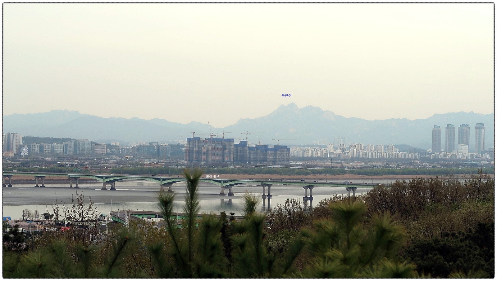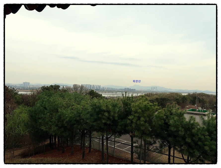 ['북한산' 조망] ★사진을 클릭하면 '북한산'이 잘 보임★ 해발 73.5m의 <모담산>이지만 주변은 <한강하구>로 대부분 평지여서 조망이 좋습니다. 날씨가 흐려 조망이 좋지 않습니다만, 그런대로 <북한산>이 조망됩니다. 사진을 클릭하면 <북한산> <도봉산> <수락산> <불암산>까지 보입니다. 서울에서만 바라보던 <북한산><도봉산>을 한강하구에서 다른 각도로 바라보니 매우 새롭습니다.