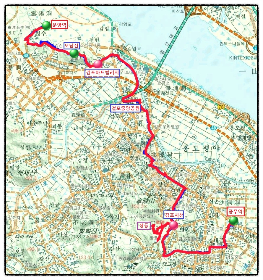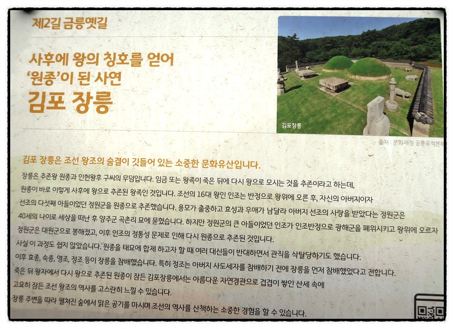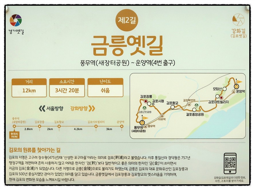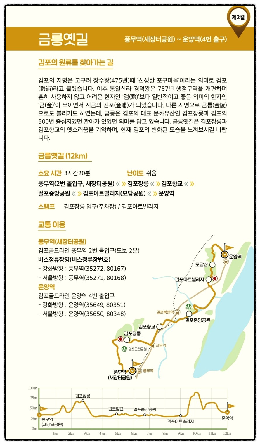 『경기옛길』 『강화길 제2길 금릉옛길』 풍무역-새장터공원-장릉-김포시정-사우역-김포향교-걸포사거리- 계양천산책로-걸포중앙공원-김포한옥마을-모담산공원-운양역['2코스 금릉옛길 안내도']