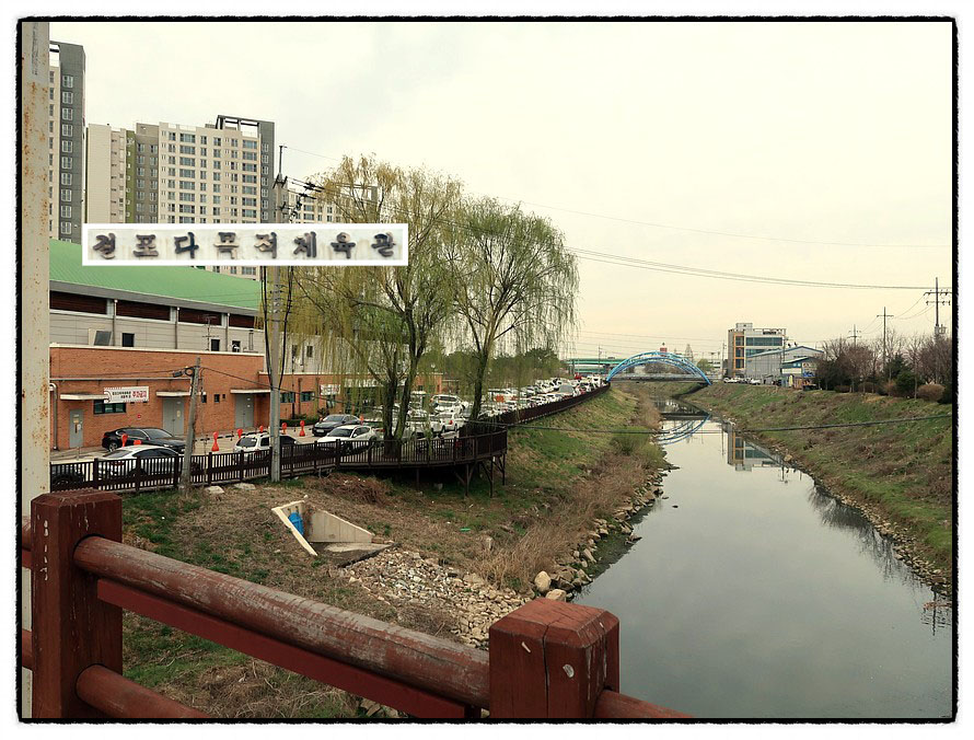 ['걸포다목적체육관'] 다리 위에서 진행방향을 조망하는데 <걸포다목적체육관>이 있습니다. <계양천>을 따라 다음 다리가 있는 곳까지 가면...