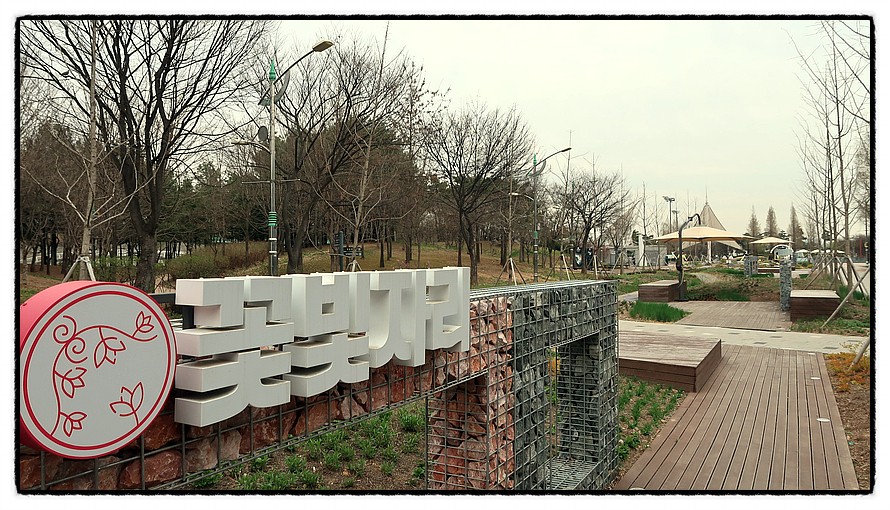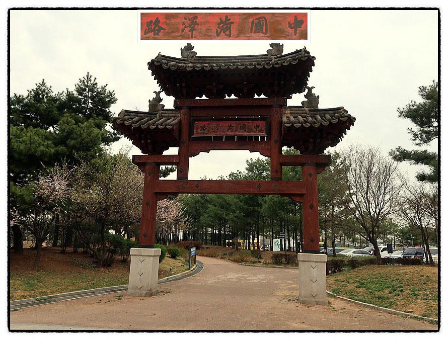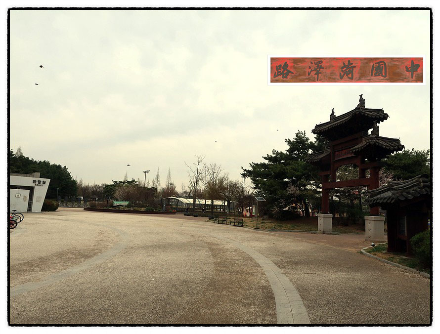 ['중국하택로'] 공원 입구에서 주차장 좌측으로 들어 가면 먼저 "중국하택로 中國荷澤路"라는 현판이 붙은 중국식 문을 만나는데 2009년에 <중국 하택시>와 <김포시>가 자매결연을 맺은 기념으로 만들었다고 하네요. 공사비가 500억원에 6,000㎡크기라고 하는데 들어 가 보지는 않고 좌측 공원으로 바로 갑니다.