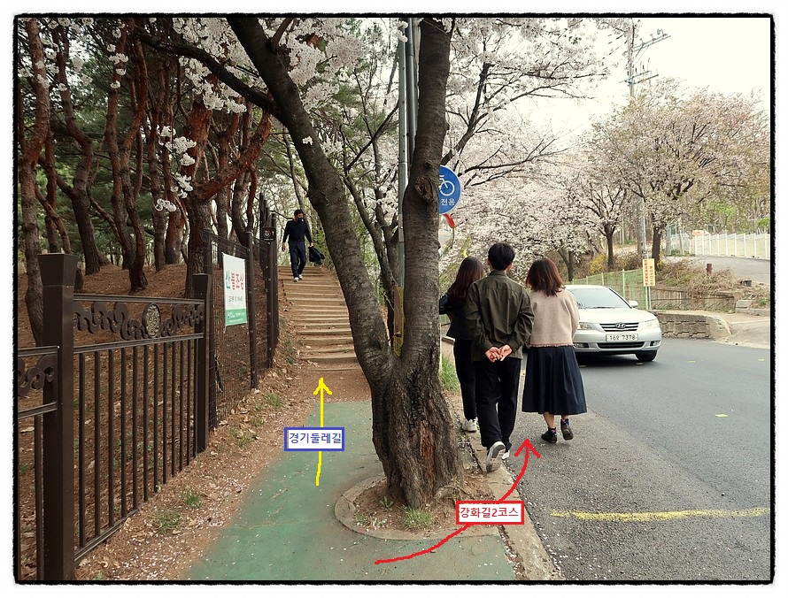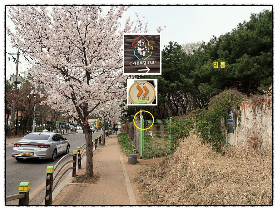 [갈림길] 12:22 ★길조심★ 정문을 나서면 <강화길>은 좌측으로 방향을 바꾸는데 길조심을 해야 하더군요. 좌측 <장릉> 울타리 방향은 <경기옛길>이며 우측 도로가 <강화길>이더군요. 그러니까 <아라뱃길여객터미널>에서 함께 하던 <경기둘레길>은 여기서 헤어지는 것입니다.