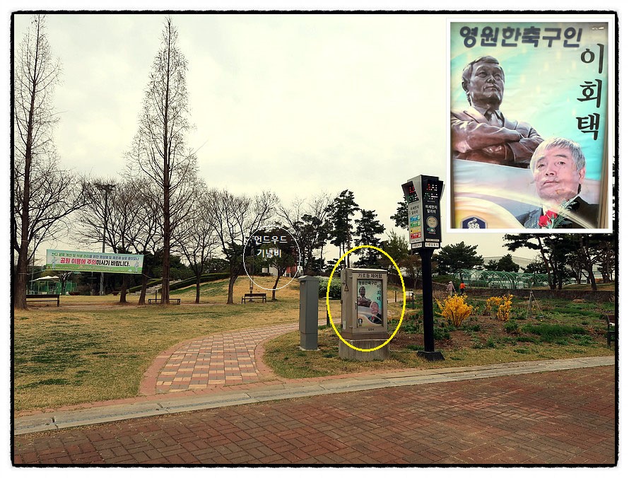 ['언더우드 기념비'] <이회택선수> 사진 뒤에는 <언더우드 기념비>가 세워져 있습니다. <연희전문학교> 초대 교장을 지내며 <새문안교회>를 설립한 선교사였지요.