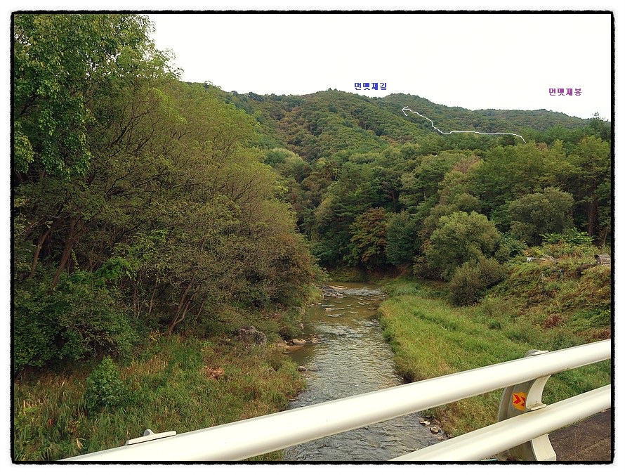 ['물골'과 고갯길 조망] <해안>에 내리는 빗물이 모여 흘러 나가는 <물골>을 바라보고 잠시후 넘어야 할 <먼맷재길>을 조망합니다.